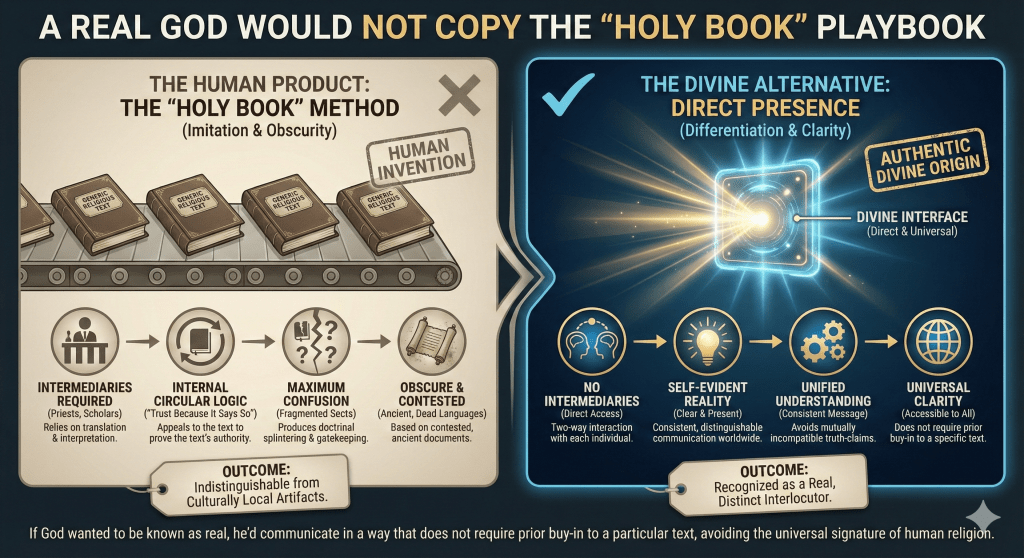 Similarly, what should we conclude about a book that claims an omnipresent, loving God exists but never provides a direct encounter? Many believers in other proposed Gods also report vague feelings of divine presence, so why is there no clear, distinguishing interaction?