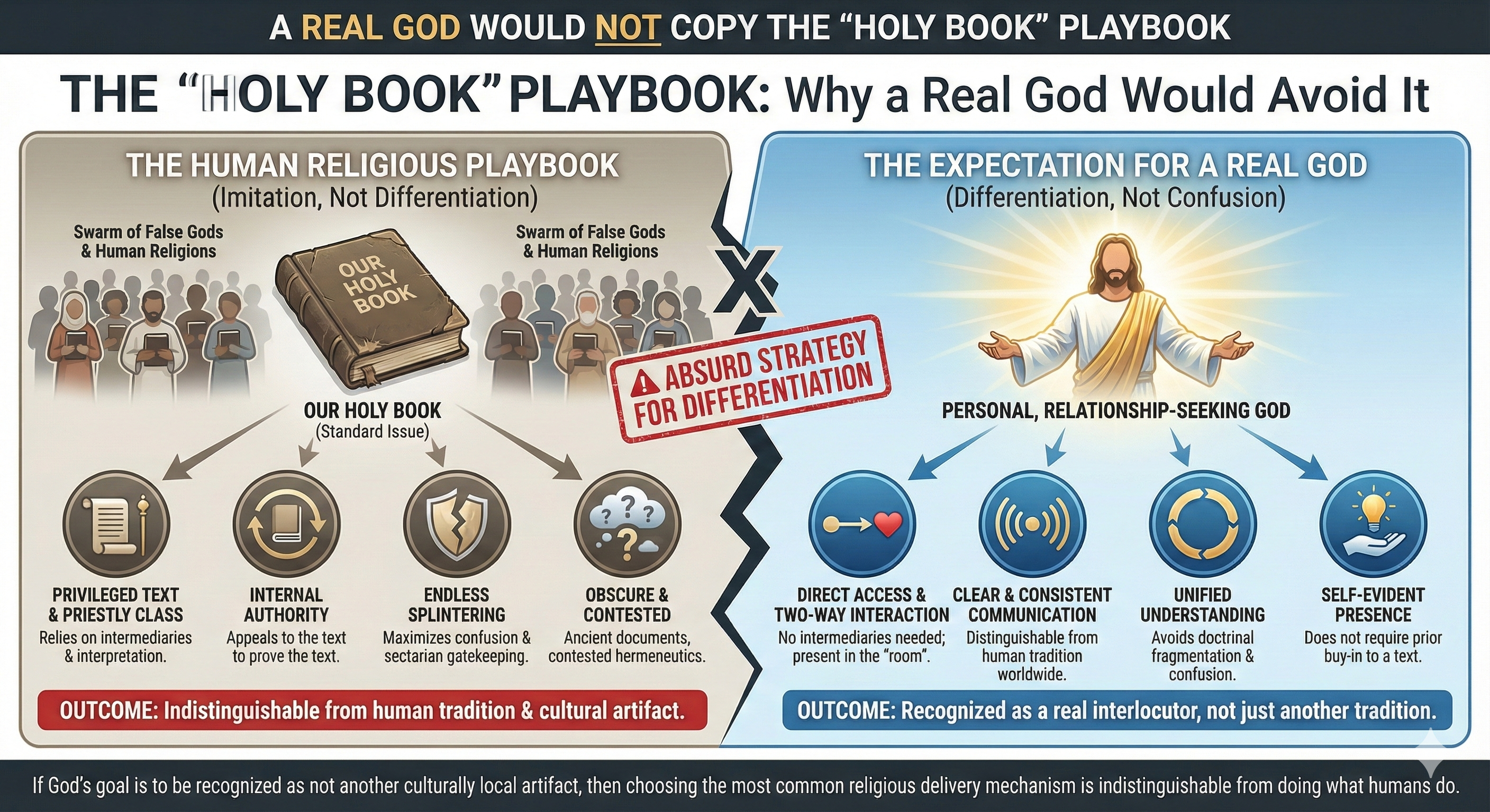 Summary: Why would a personal God who desires a relationship rely on a book for revelation rather than direct encounters, especially given claims of omnipresence and omnibenevolence? This content argues that divine hiddenness and the reliance on indirect methods make God indistinguishable from other deities, casting doubt on the sufficiency of evidence and the authenticity of faith that discourages open inquiry.
