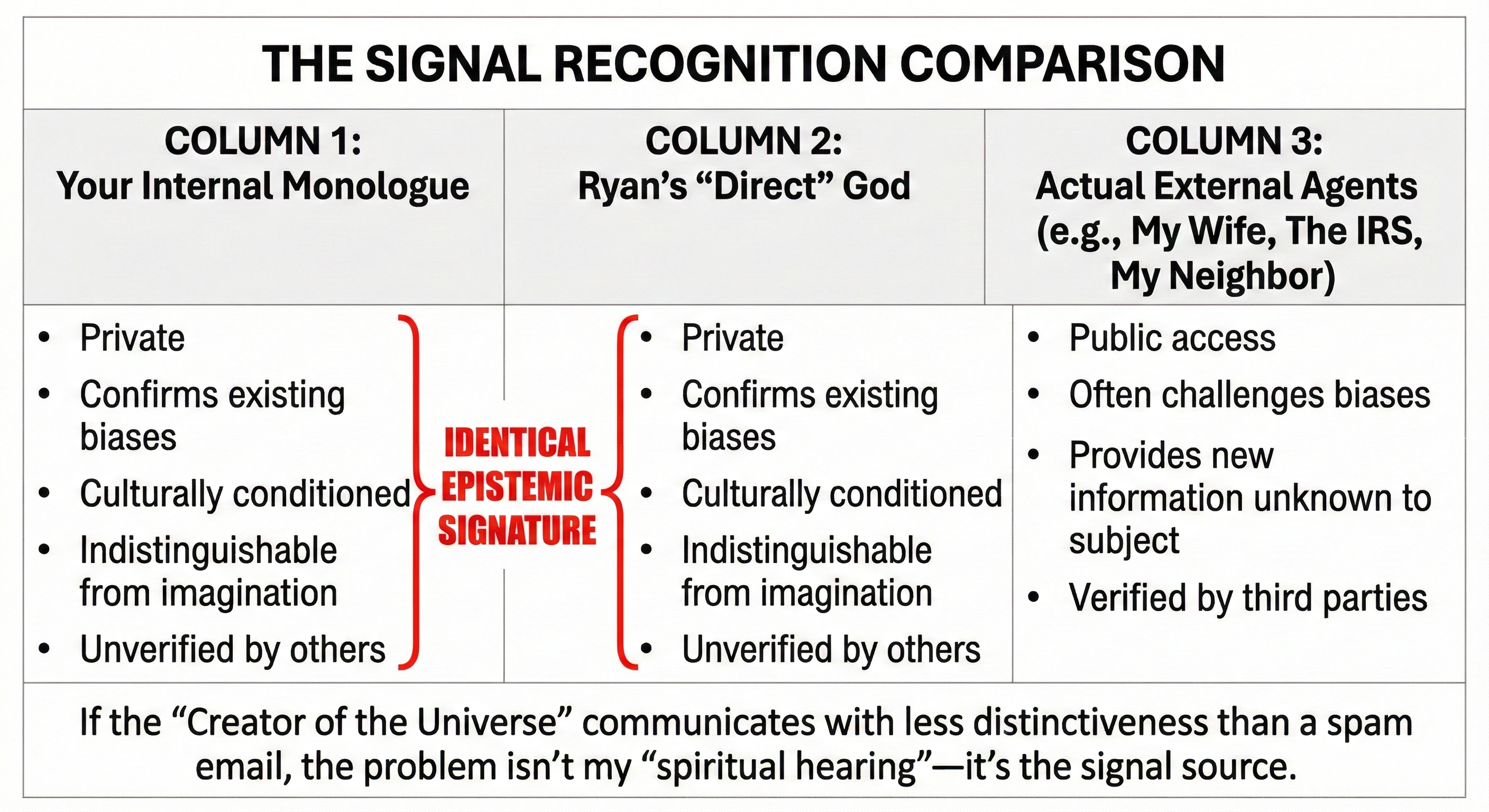 CLARUS: Yet, that’s exactly what causes confusion, Chris. By relying on the same indirect methods—scripture and feelings—the Christian God ends up looking indistinguishable from countless other gods. That seems at odds with the idea of a unique, all-powerful deity who desires a relationship with us.