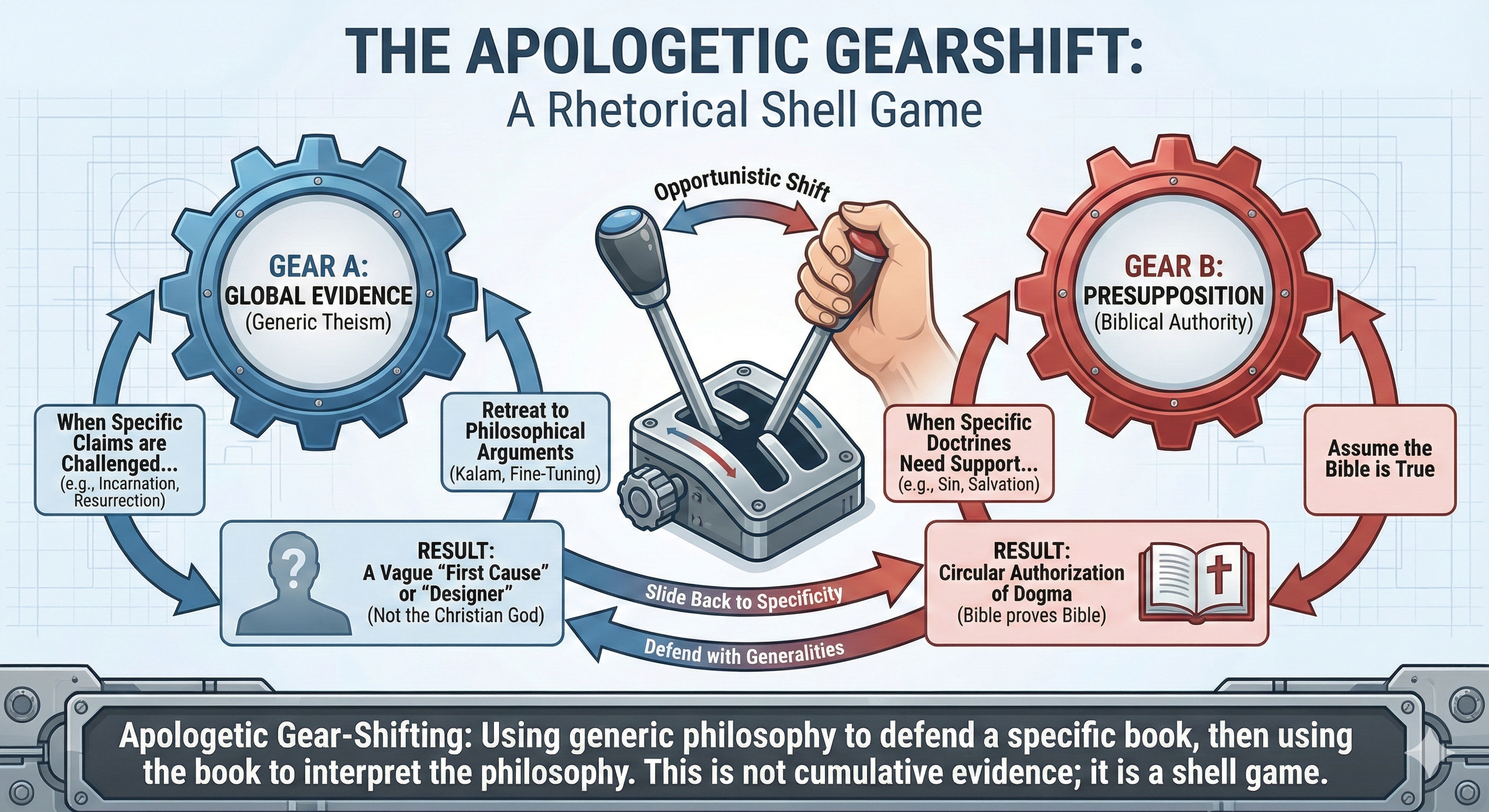 Fallacy: Equivocation — Uses metaphor to escape logical scrutiny.