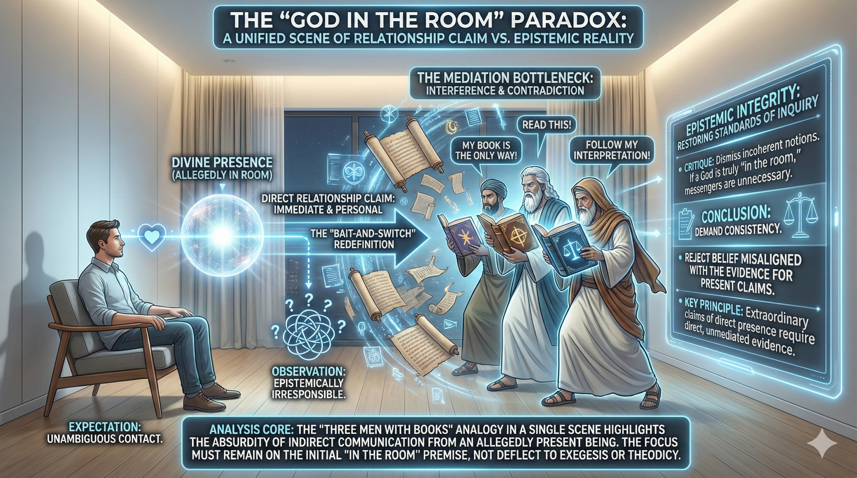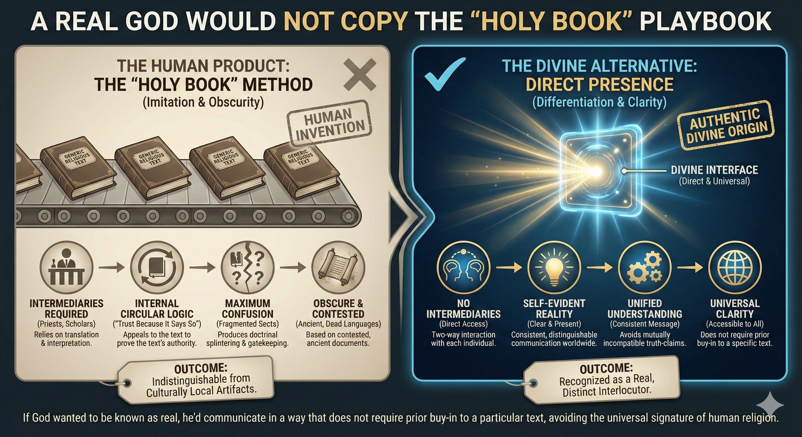 Summary: Why would a personal God who desires a relationship rely on a book for revelation rather than direct encounters, especially given claims of omnipresence and omnibenevolence? This content argues that divine hiddenness and the reliance on indirect methods make God indistinguishable from other deities, casting doubt on the sufficiency of evidence and the authenticity of faith that discourages open inquiry.