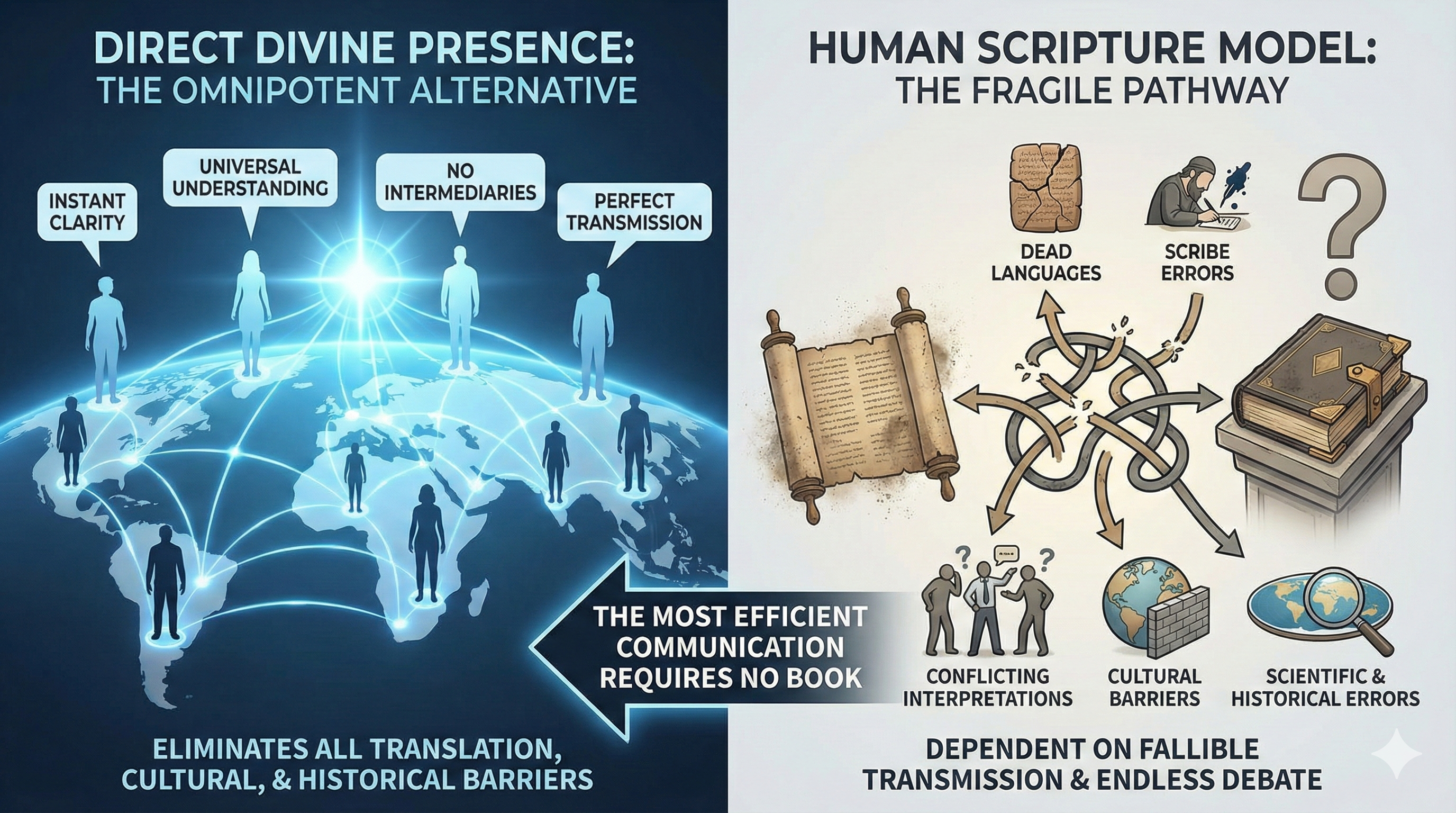 Consider a teacher who insists on being the best guide for his students but communicates solely through notes slipped under the classroom door, never appearing in person. The students, left to interpret his instructions on their own, often misinterpret his teachings and argue over his intentions. Similarly, a God who chooses a book as his primary communication method rather than direct interaction can leave believers struggling with different interpretations, suggesting that such a method may not be suited to an all-knowing deity who wants to ensure understanding.
