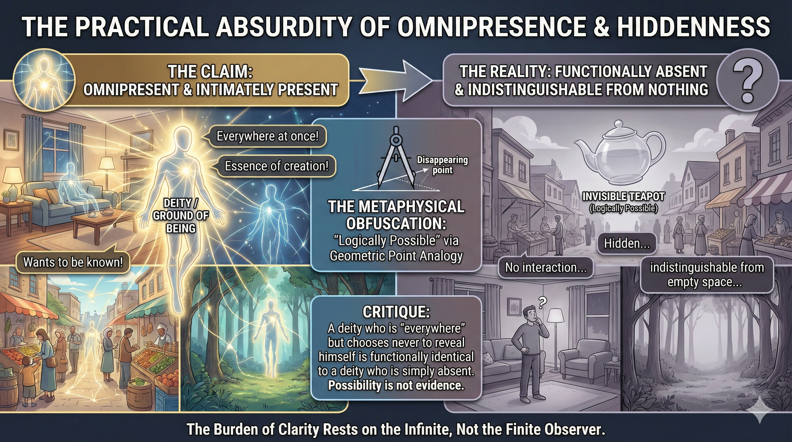 Imagine a friend you have never met in person who claims to be standing invisibly behind you at every moment, ready to support you, but never speaks or appears when you need him. He only leaves messages that you find days later, and even then, they are often vague and hard to interpret. Like this friend, a God who is supposedly omnipresent but remains hidden despite professing care leaves those seeking him feeling uncertain, raising doubts about his intentions and commitment to a genuine relationship.