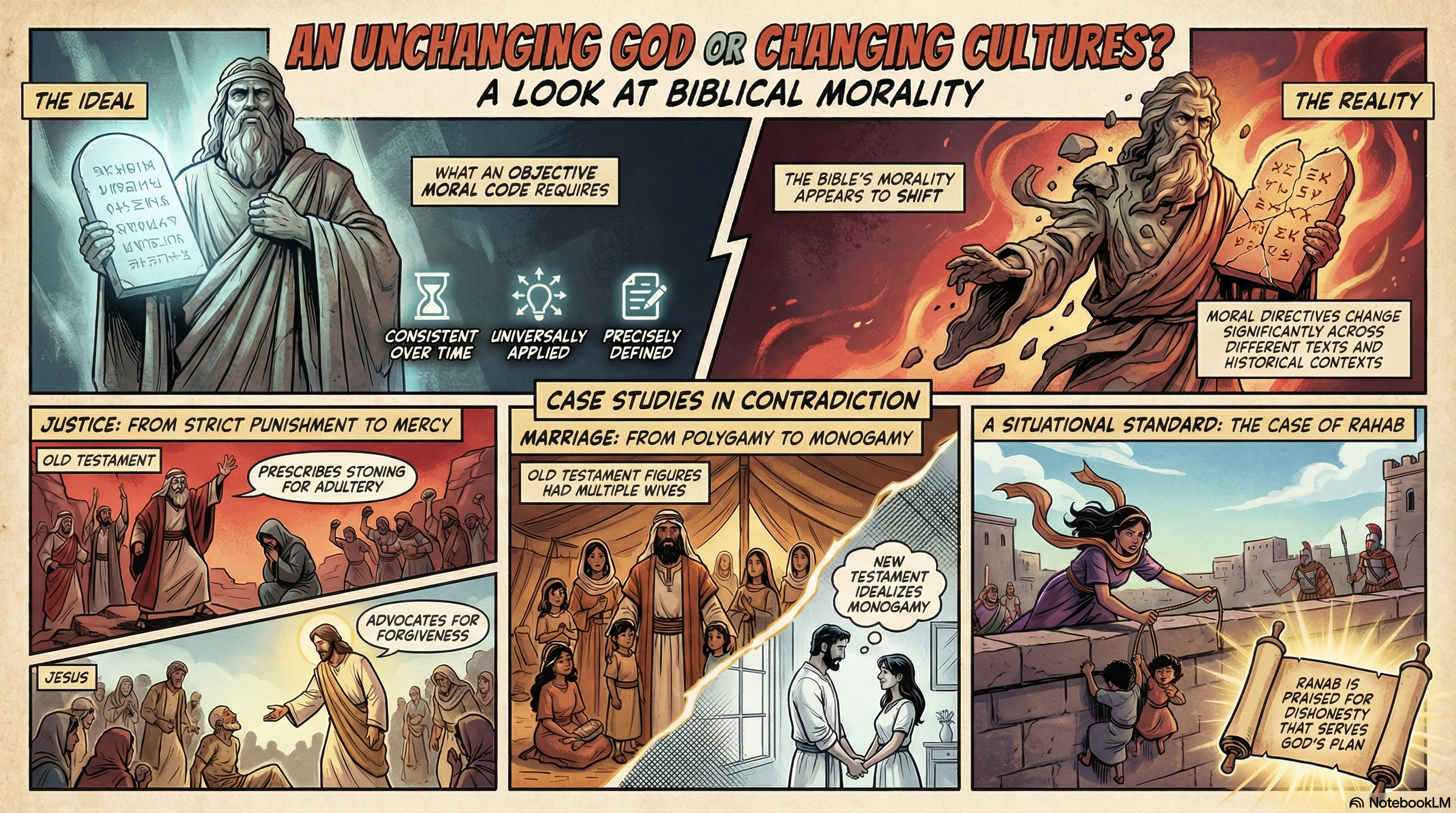 - Premise 2: The Bible shows significant changes in moral commands, such as the shift from strict Old Testament punishments to New Testament messages of forgiveness.