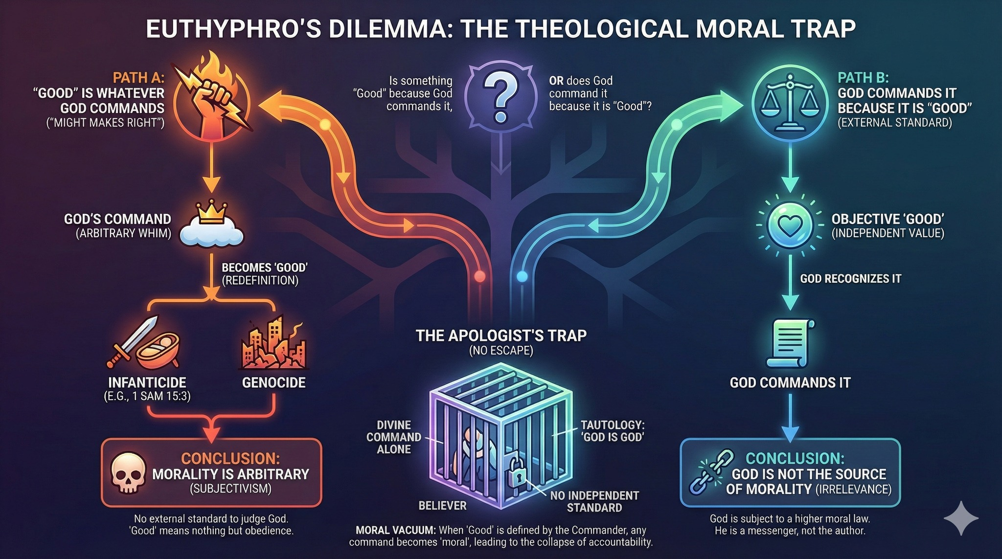 The Bible’s moral directives are often presented as divine commands, suggesting an ontological foundation rooted in God’s will. However, this raises the Euthyphro dilemma: Are actions moral because God commands them, or does God command them because they are moral? If the former, morality appears arbitrary; if the latter, morality exists independently of God, undermining the Bible’s role as the source of moral truth.