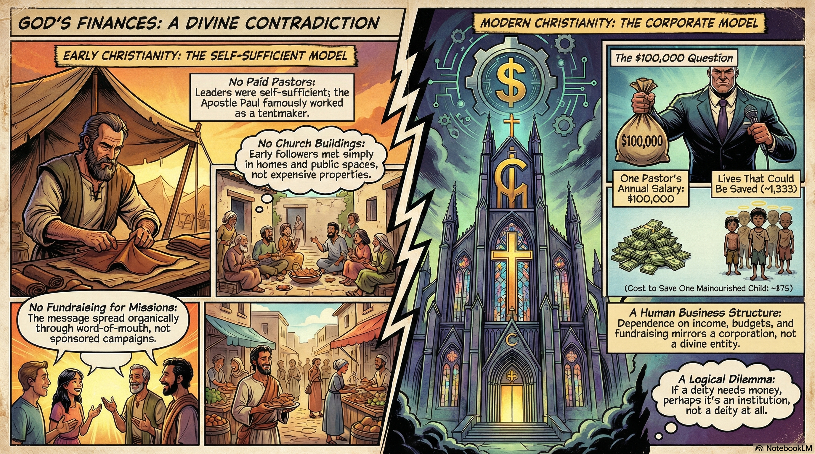 In early Christianity, faith alone was sufficient to sustain the movement. There were no bank accounts, no institutional payrolls, no marketing budgets, and yet, the movement flourished. If an omnipotent God exists, He would require no money now, just as He required no money then. The fact that modern churches are structured like businesses—dependent on income, budgets, and financial expansion—suggests that they operate on human economics, not divine power.