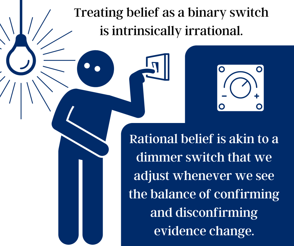 Finally, the leap of faith creates a binary belief model in which certainty is seen as morally superior to intellectual caution or doubt. Rational belief, however, holds that belief operates along a continuum, allowing for degrees of confidence that reflect degrees of evidence. This continuum promotes epistemic humility—recognizing that certainty should be proportional to the strength of evidence. In the leap of faith, certainty is elevated as a virtue, turning doubt into an intellectual failing. This mindset prevents truth-seeking, as beliefs resistant to scrutiny and revision risk becoming dogmatic rather than open to evidence. Just as overconfidence in poker leads to risky, ill-informed bets, binary faith in any domain risks acting on overblown confidence rather than the realities of the situation.