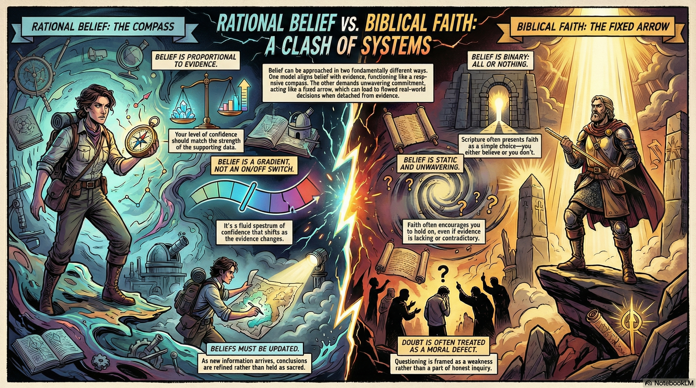 CLARUS: Faith and rational belief serve different functions. Rational belief aligns its confidence level with the strength of the evidence, adjusting as evidence changes. Faith, especially in a biblical sense, often operates as a binary commitment: you either believe fully, or you don’t, regardless of evidence.