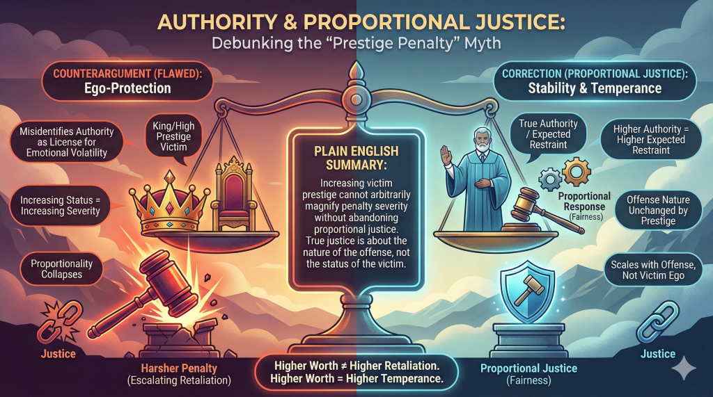 This argument misidentifies authority as a license for escalating emotional retaliation. The higher the authority, the higher the expected emotional restraint. We expect kings, judges, and leaders to embody greater stability and temperance, not greater volatility. If increasing status yields increasingly severe penalties for the same offense magnitude, proportionality collapses. An offense against a being of elevated worth does not change the nature of the offense itself, only the psychological reaction of the offended party. A justice model that scales punishment with the emotional fragility or prestige of the victim transforms justice into ego-protection rather than proportionate response.