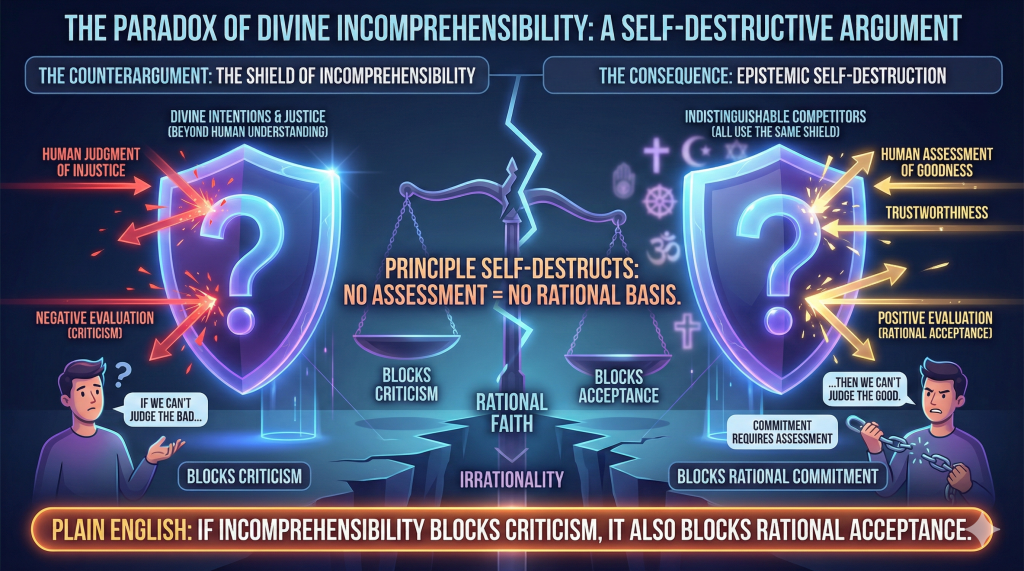 This argument self-destructs epistemically. If humans cannot evaluate whether a deity is just, then humans cannot evaluate whether a deity is trustworthy, good, coherent, or worthy of worship. This makes Christianity indistinguishable from all other competing religions; each could invoke exactly the same shield of incomprehensibility. A principle that blocks negative evaluation also blocks positive evaluation. One cannot rationally commit to a being whose actions cannot be assessed, because commitment itself requires assessment.