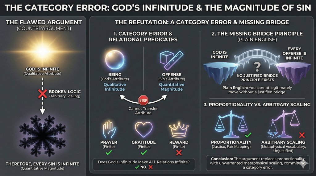 Plain English: You cannot legitimately move from “God is infinite” to “every offense is infinite” without a justified bridge principle, and no such principle exists.