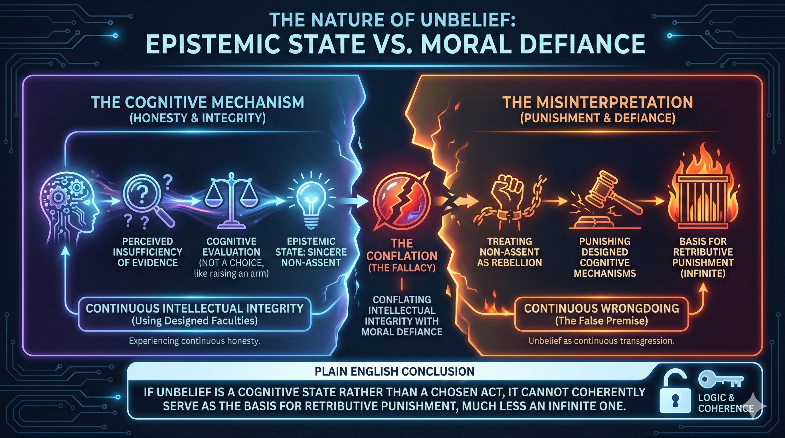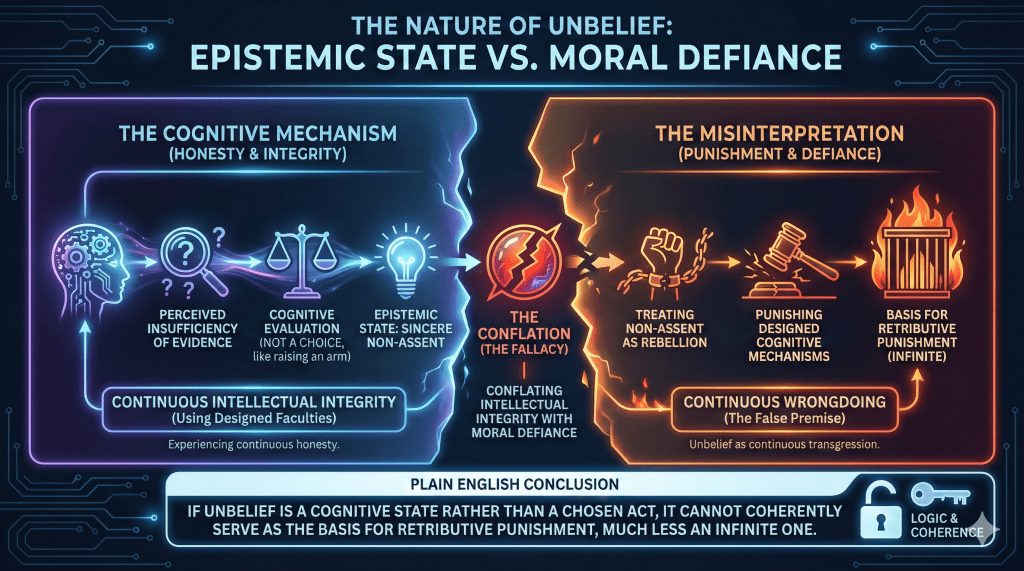 Plain English: If unbelief is a cognitive state rather than a chosen act, it cannot coherently serve as the basis for retributive punishment, much less an infinite one.