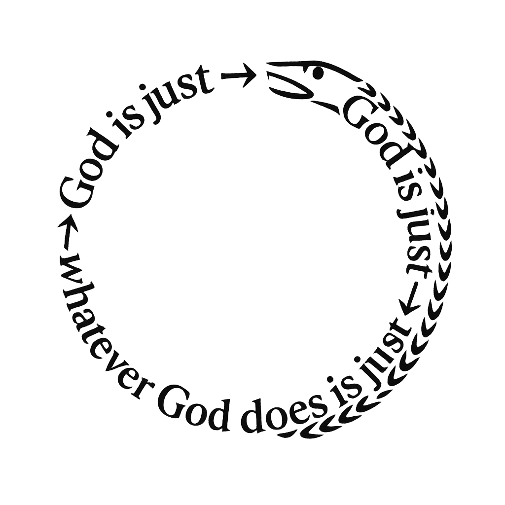 1. The apologist’s core premise, E(p, q) \leftrightarrow C(p, q), defines justice not by principles like proportionality or equivalence, but solely by divine will.