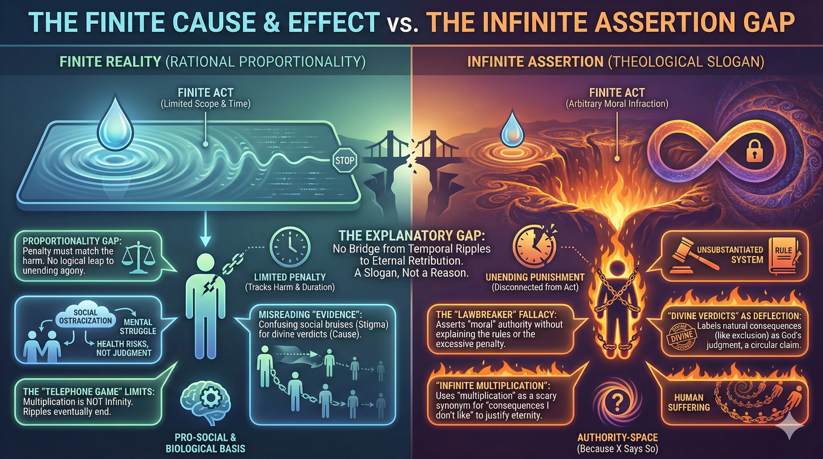 - Infinite Punishment for Finite Offenses: No offense committed within the constraints of time and human capacity can logically warrant infinite punishment. For example: