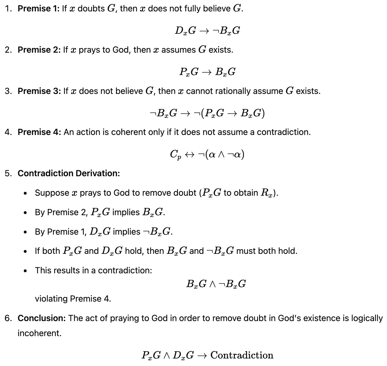 Since holding both G and \neg G is a contradiction, this demonstrates the incoherence of an atheist affirming Turek’s premise while remaining an atheist.