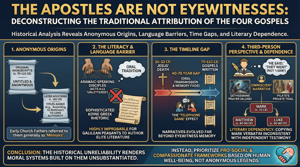 The claim that the Apostles can be considered “eyewitnesses” to Jesus’ alleged resurrection in a way that holds up to contemporary scrutiny fails when measured against the seven rigorous criteria for legitimate eyewitness status. These criteria—rooted in legal, logical, and psychological standards—demand directness, immediacy, and reliability that the Apostles’ accounts, as received in 2025, cannot satisfy due to the historical and textual realities of their transmission. Below, I evaluate each criterion in turn, demonstrating why the claim collapses under systematic analysis.