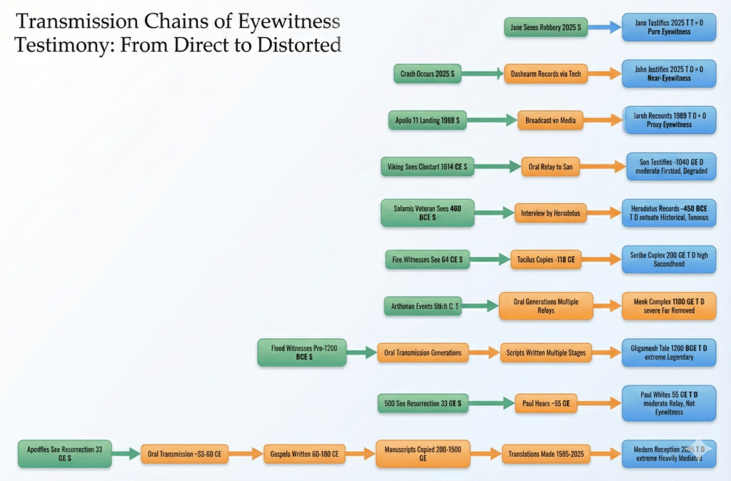 The assertion by contemporary Christians that the dead Apostles remain “eyewitnesses” to Jesus’ acts (e.g., Resurrection) collapses under scrutiny due to the protracted, convoluted communication chain spanning 33 CE to 2025 CE. An eyewitness, by legal and logical standards, requires direct sensory perception of an event (E), unmediated testimony (T), and negligible distortion (D). Define: