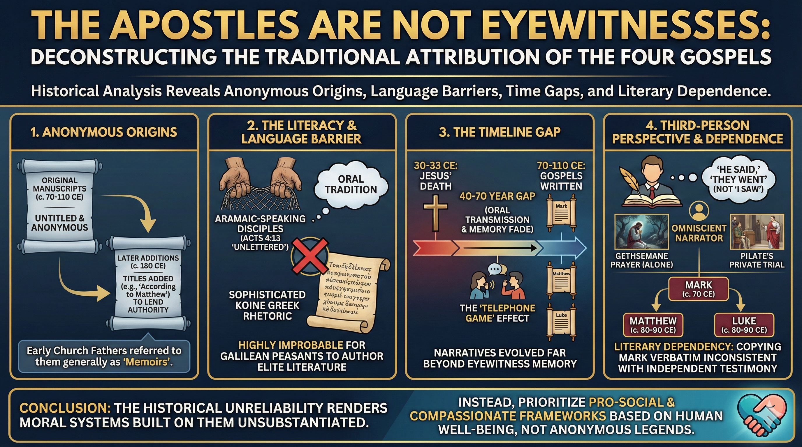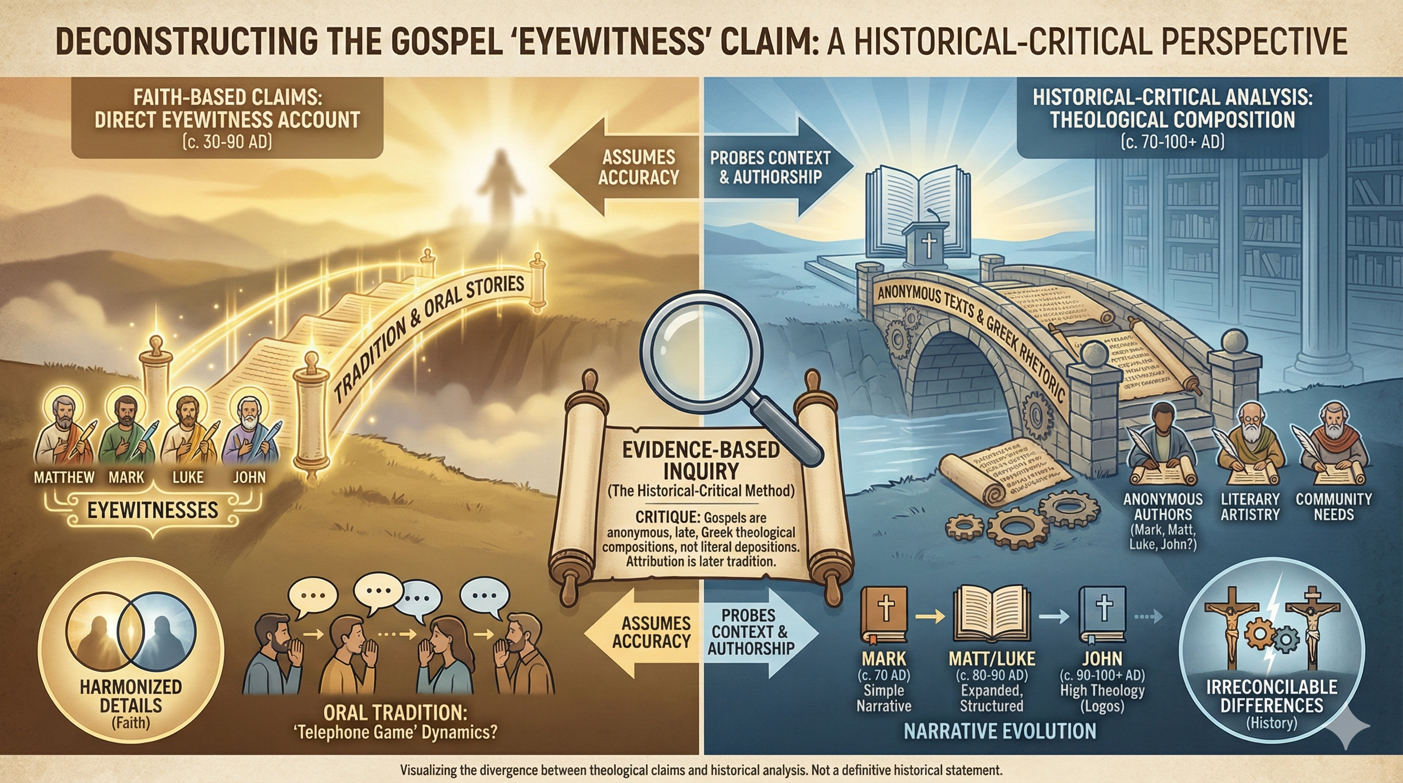 Imagine standing in a courtroom, listening to a witness recount a crime they saw just yesterday—crisp, vivid, unfiltered. Now picture that same story retold across 2,000 years, whispered through countless voices, scribbled on crumbling scrolls, recopied by candlelight, and translated across languages and empires. By the time it reaches you, would you still call that first observer an “eyewitness”? This is the quandary Christians face when they label the Apostles—those who reportedly saw Jesus rise in 33 CE—as “eyewitnesses” today. What begins as a bold claim of firsthand truth unravels under the weight of a communication chain so long and tangled it resembles a game of telephone stretched across millennia.