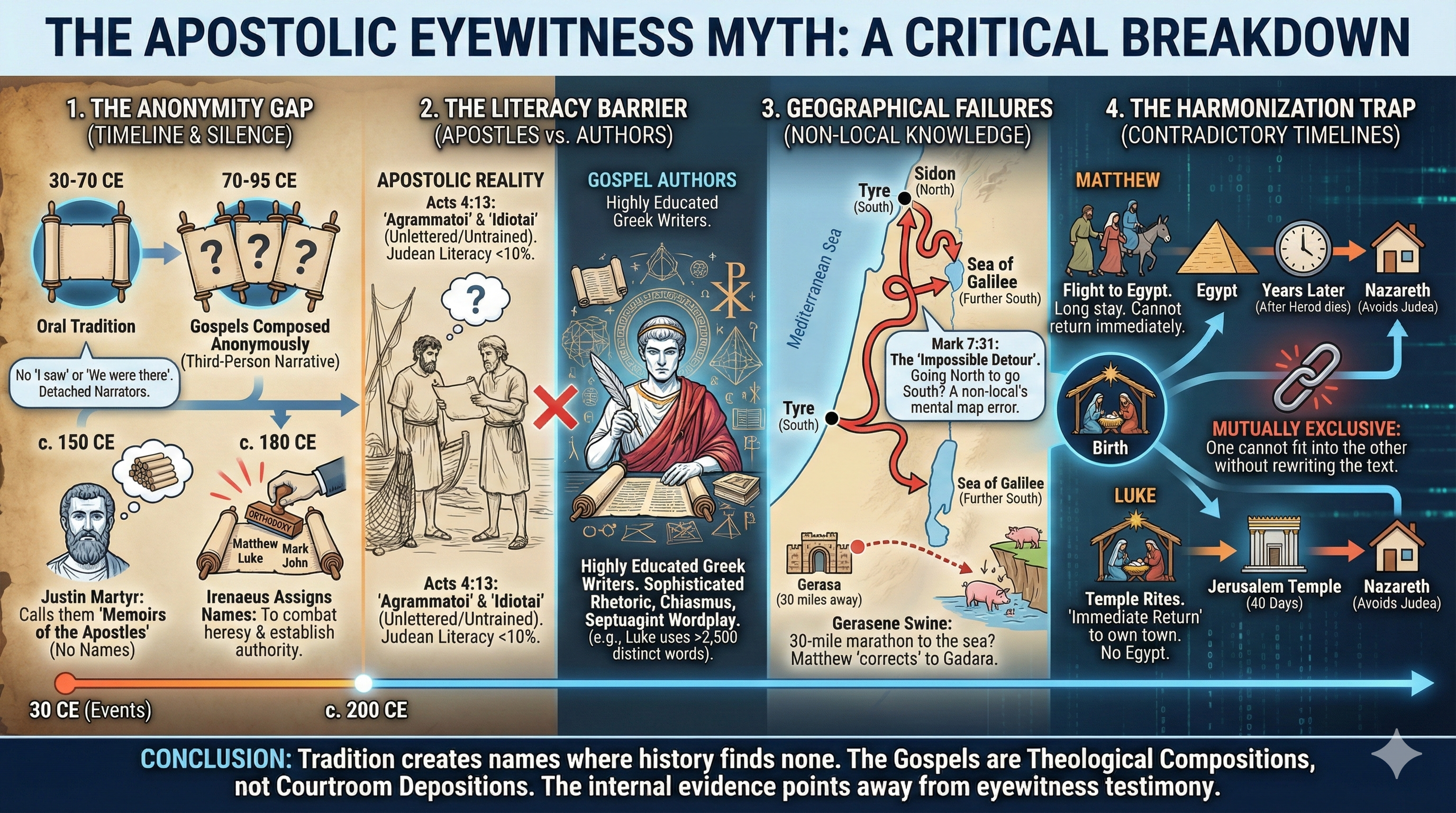 ’s noise. Christians might invoke divine preservation, but absent empirical support, “eyewitness” is a misnomer—logically absurd in 2025. It’s a fossilized claim, not a living witness.
