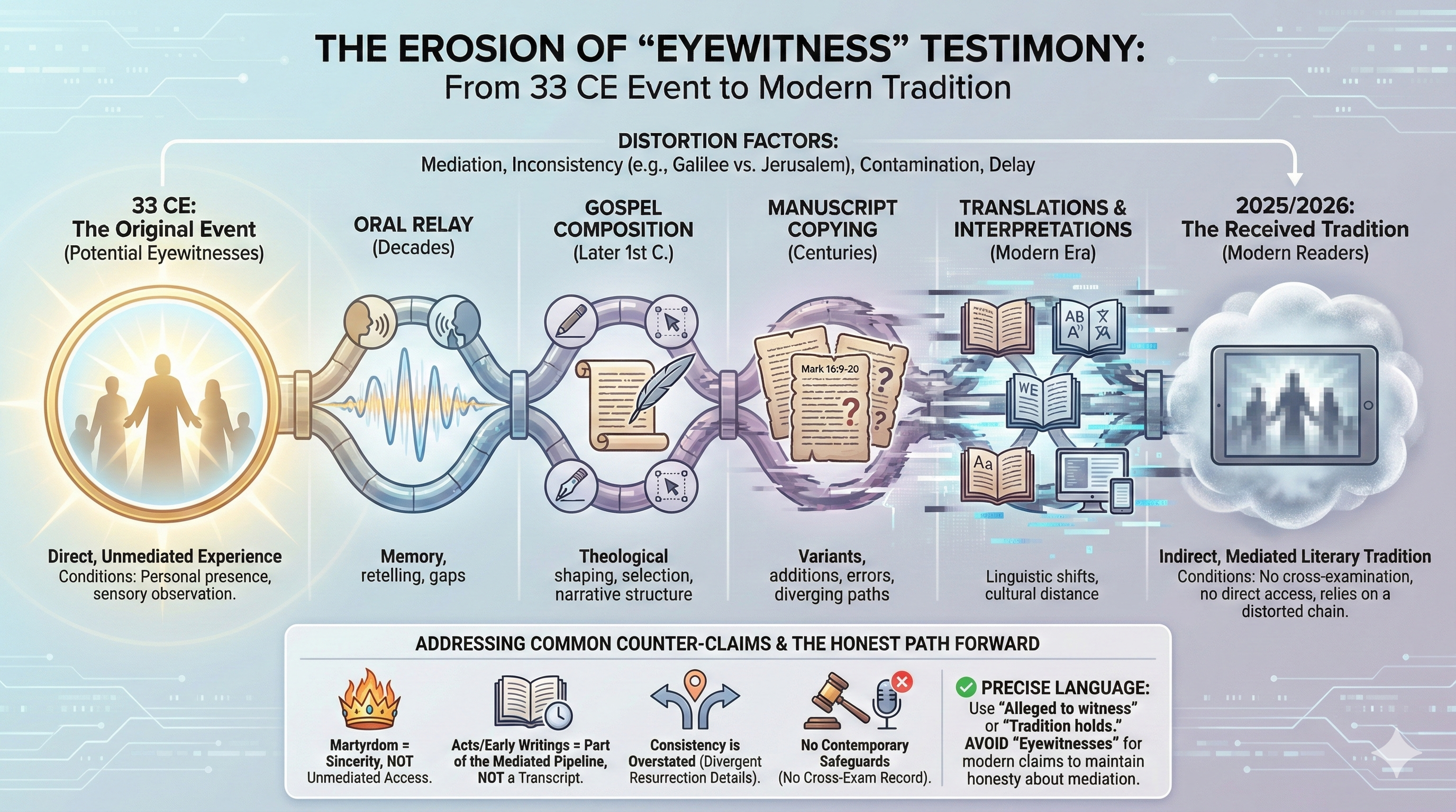First, anchor the claim in its historical context using past-tense verbs and qualifiers. Phrases like “The Apostles are alleged to have witnessed Jesus’ resurrection” or “Tradition holds that the Apostles directly saw the risen Jesus” emphasize that this is a reported event from 33 CE, not a present reality. Avoid active, present-tense constructions like “The Apostles serve as eyewitnesses” or “The Apostles testify to the resurrection,” which suggest they’re delivering testimony to us now, unmediated. Such phrasing falsely implies they meet modern eyewitness criteria—like directness or cross-examination—which they cannot, given their deaths and the intervening Gospel authorship, manuscript copying, and translations.