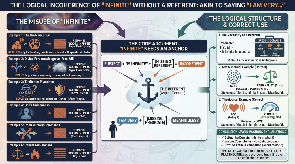 The phrase “God is infinite” often appears as a knee-jerk response in theological debates. While it might sound profound, it risks logical incoherence if left undefined or taken as an all-purpose reply to challenges. Below is a concise analysis illustrating why “God is infinite” can be logically problematic or incoherent when used without precise clarification.