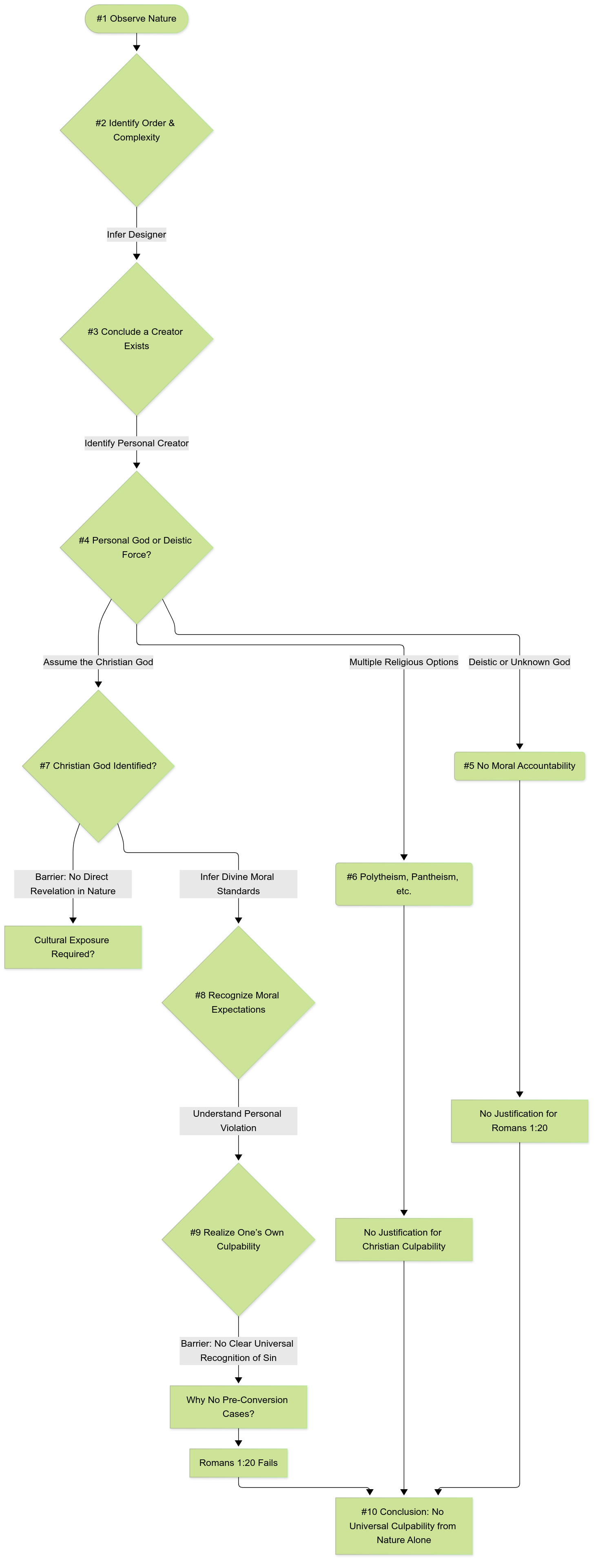 Romans 1:20 claims that all people are without excuse because God’s existence and moral expectations are evident through nature alone, without any prior knowledge of Christianity. However, each step of inference requires independent justification before progressing to the next.