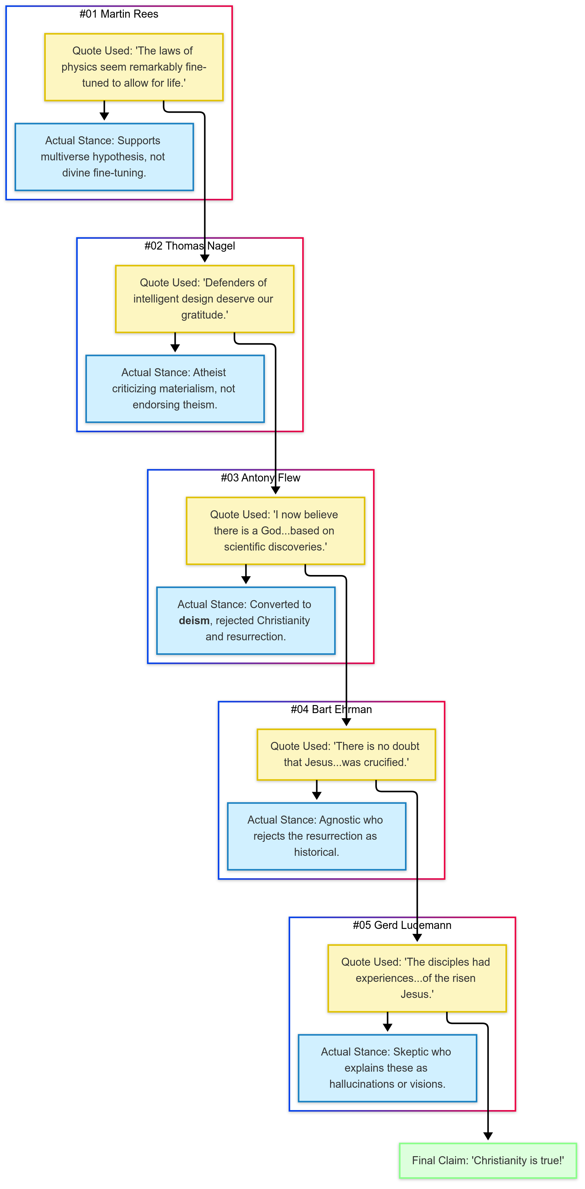 This chain exemplifies the Stepping-Stone Fallacy, with each step selectively quoting to create a misleading path from fine-tuning to the resurrection of Jesus.