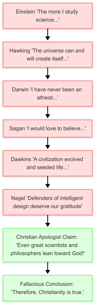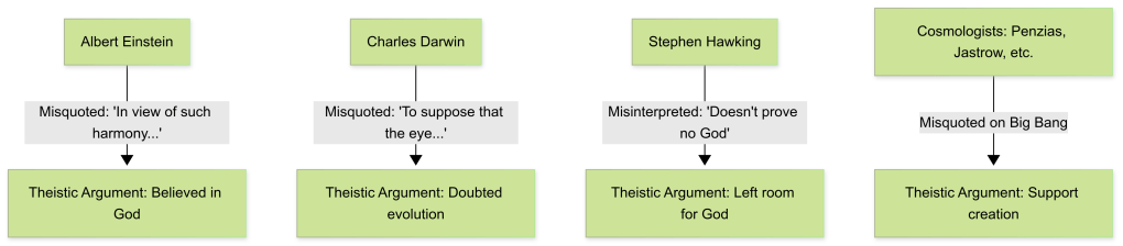 • Figures like Einstein, Hawking, and Darwin are often misquoted, creating a misleading chain of support for theism.