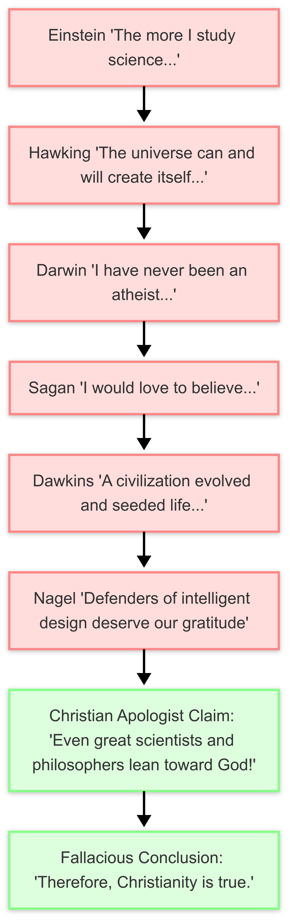 The Stepping-Stone Fallacy occurs when individuals cherry-pick specific points from authorities they generally disagree with, like non-theists, to build a chain of support for their theistic arguments. This creates a false sense of credibility, often misrepresenting the original views. Below, we explore examples found online, focusing on how these quotes are used and misused.