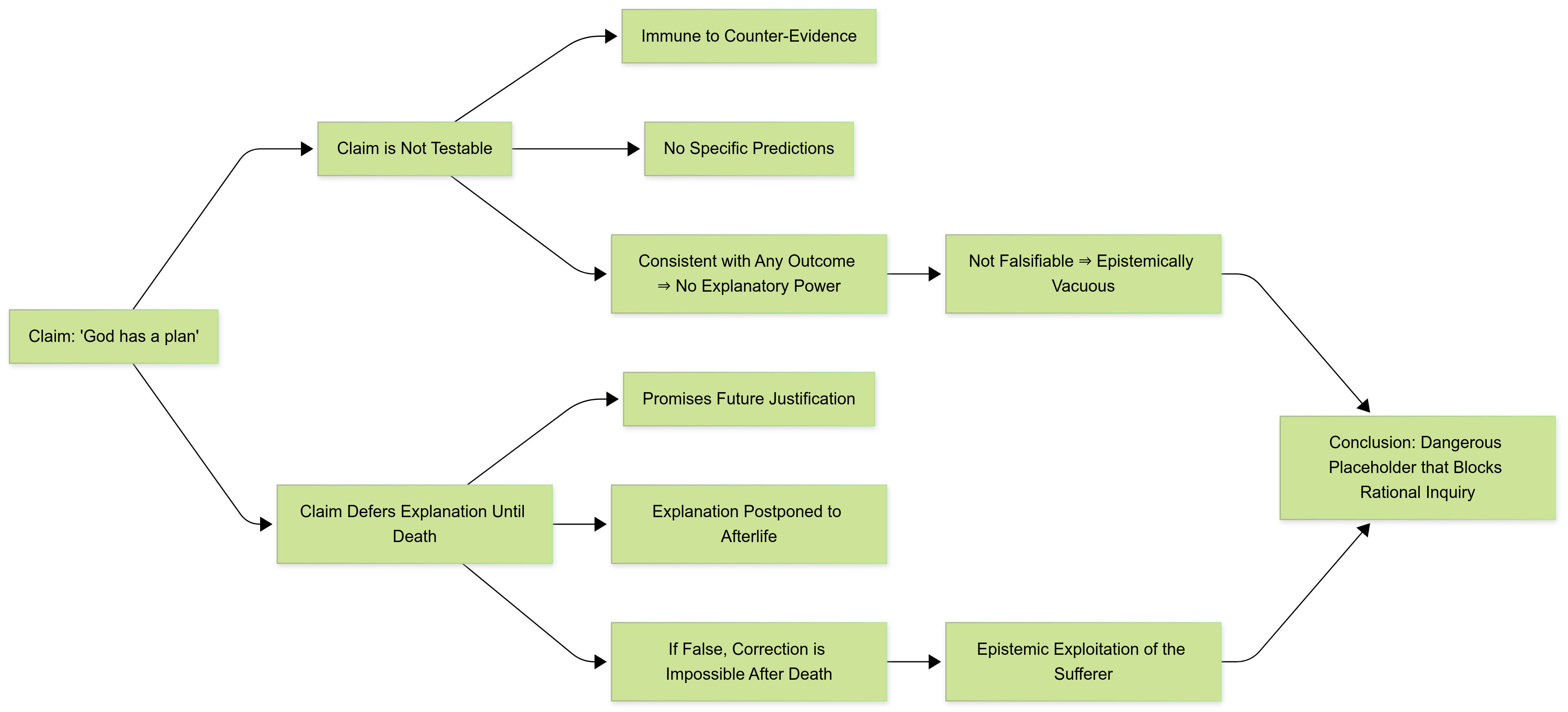 In conclusion, the phrase “God has a plan”, though emotionally appealing, collapses under epistemic scrutiny. It is not testable, because it is consistent with all possible outcomes, and it defers explanatory accountability to a moment that is post-verifiable. As such, it stands as a dangerous placeholder—a means of avoiding rational investigation and silencing the cry of suffering with vague metaphysical promissory notes. If there is no actual plan, the cost of false consolation is borne entirely by the sufferer, who is left without justice, answers, or recourse.