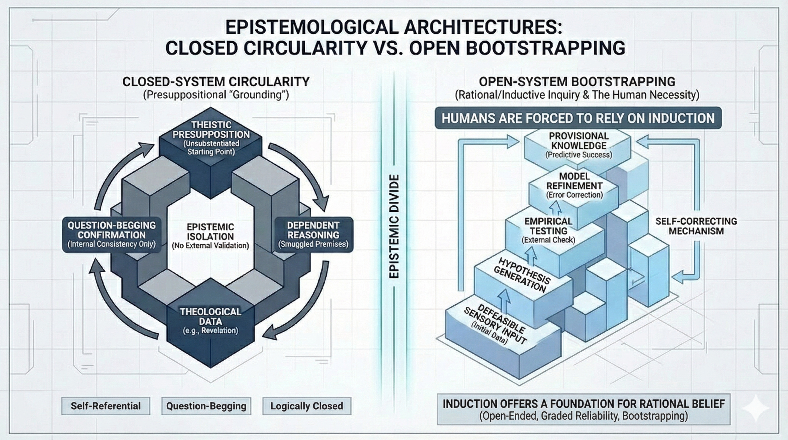 A fallible mind must proportion its expectations to patterns actually observed in the world. Nothing in human cognition requires presuppositions. Everything required for justified rationality — logic, sense-reliability, induction — is learned through evidence, reinforced by evidence, and always open to revision in light of evidence. This is not a philosophical weakness. It is the foundation of rational thought.