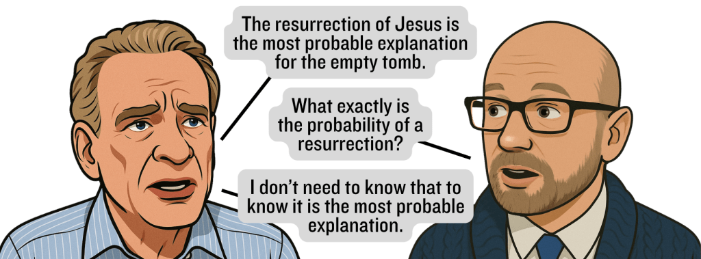 Bayesian reasoning isn’t magic. It can’t rescue a claim whose prior hasn’t been defended. Until apologists are willing to say what they think the prior probability of a resurrection is—and why—then all downstream comparisons are epistemically hollow. They’re trying to win a probability contest without submitting a number.