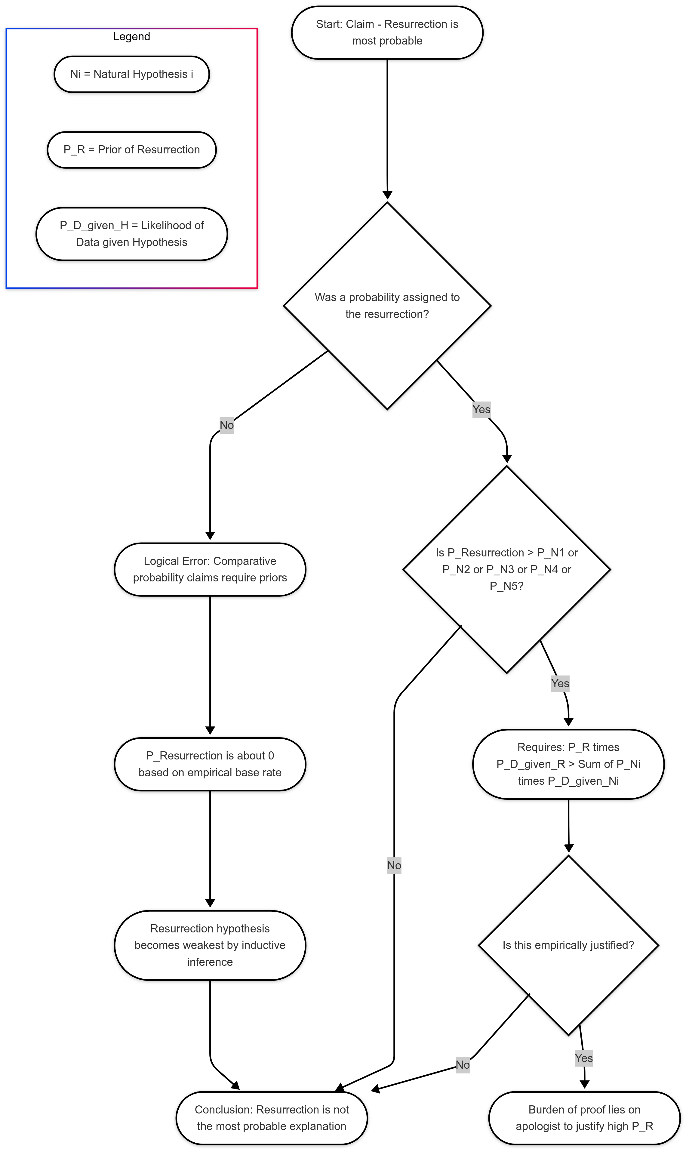 If someone claims “the resurrection is the most probable explanation,” they are making a comparative assertion. And no comparative claim is valid if one of the terms is left undefined. Until the resurrection’s prior is named, supported, and compared against the disjunction of natural alternatives, the argument doesn’t merely fall short—it never begins.