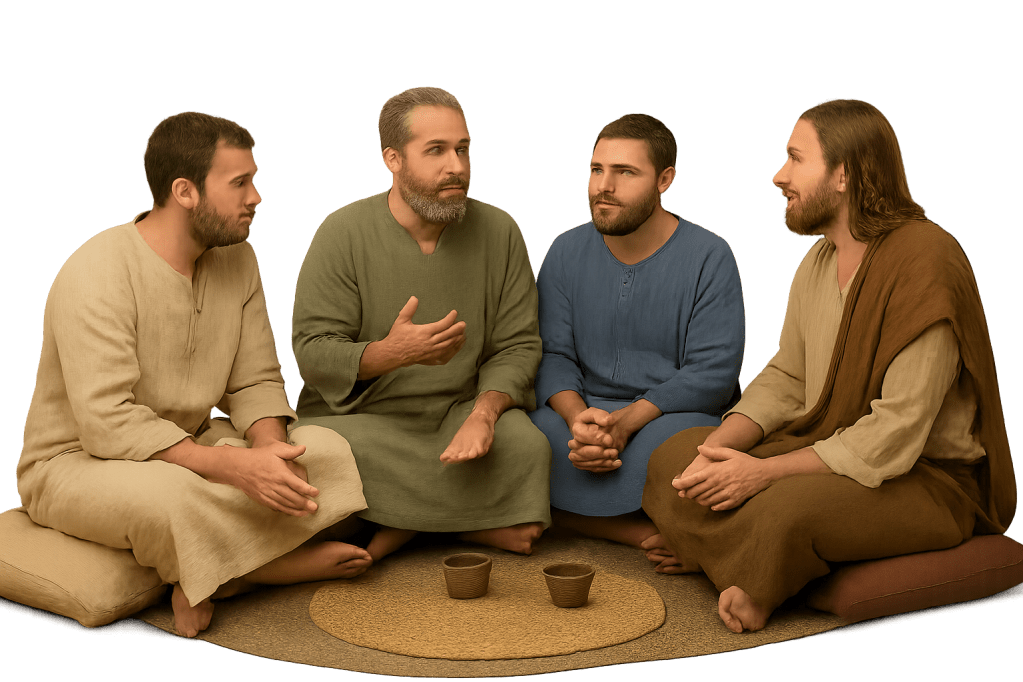 Setting: An open-air courtyard in Ephesus, AD 53. Late afternoon sun filters through olive trees, casting dappled shadows on a low stone table. The four Gospel writers—Matthew, Mark, Luke, and John—recline on threadbare cushions, surrounded by clay cups of watered wine, a half-eaten loaf of barley bread, and a chipped bowl of olives. A stray goat bleats in the distance. An awkward silence lingers, broken only by the clink of cups and the occasional sigh.