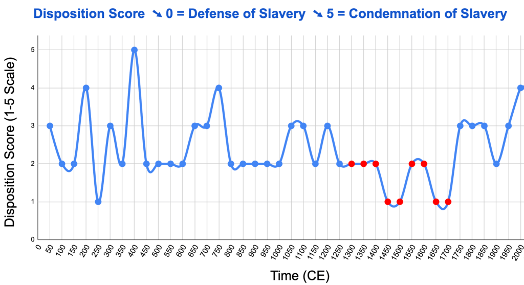 To synthesize the historical data, a 5-point scale is used to score the prevailing theological disposition of influential Christian leaders and texts toward slavery.