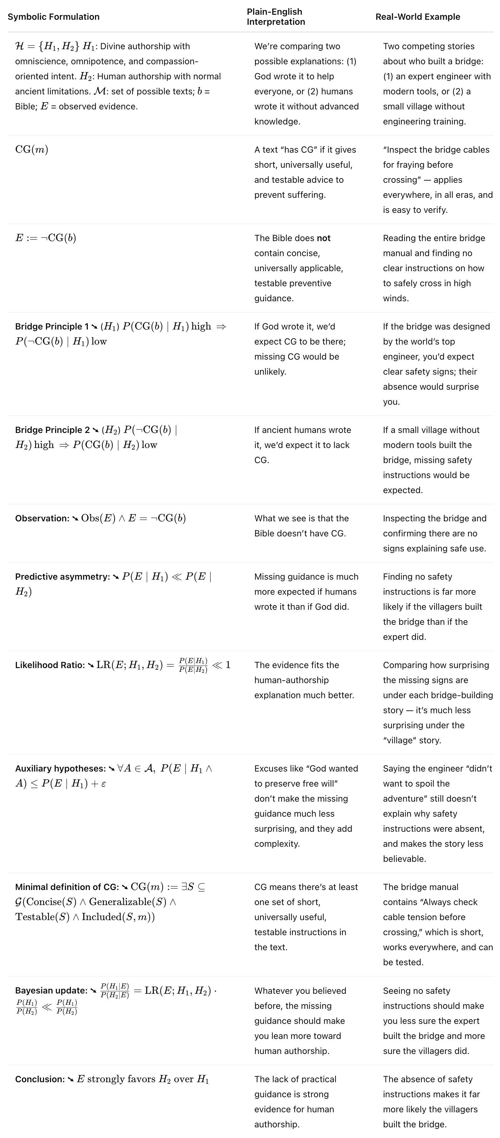 Hypotheses:: “Divine authorship with competence and compassion-orientation” (omnipotence/omniscience, intent to promote human well-being via generally usable, testable guidance).