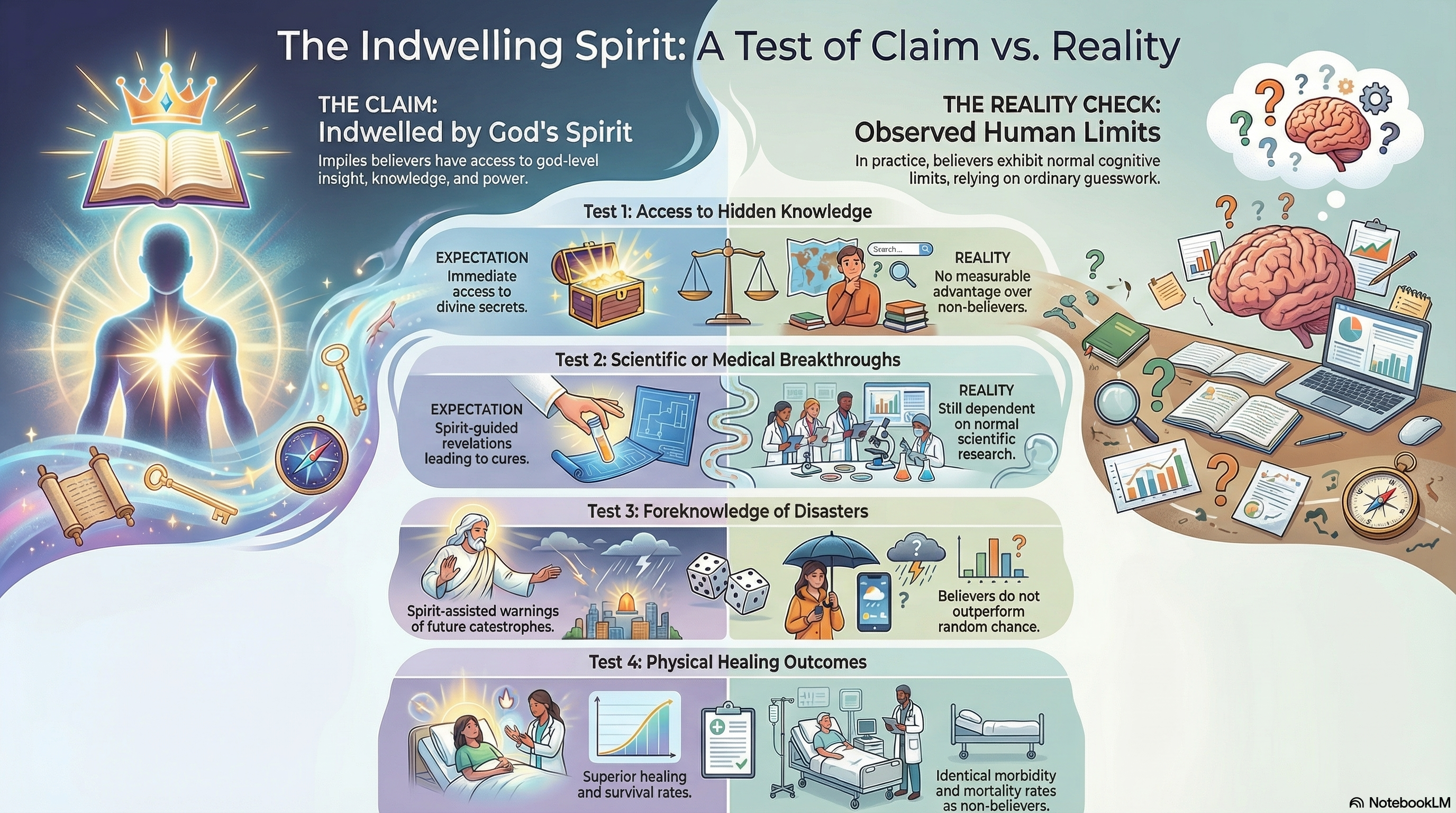 Across all four domains, the expected effects of divine indwelling fail to appear. The results align perfectly with what we would expect if believers are simply ordinary humans relying on ordinary cognition, ordinary research, and ordinary biology.