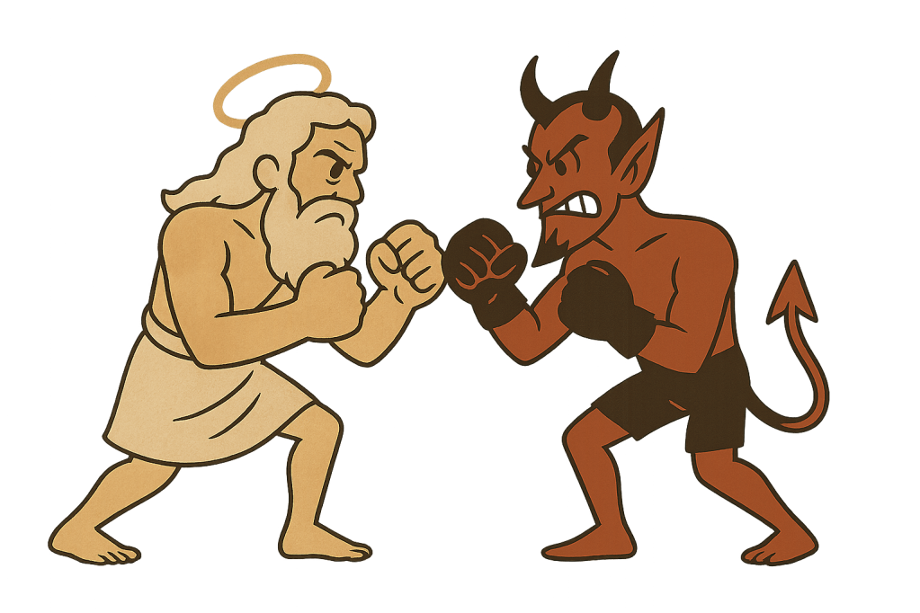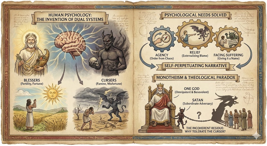 CLARUS: Humans naturally create dual-agent systems when lacking evidence but wanting explanations. Throughout history, cultures invented paired beings—gods and demons, light and dark spirits—to distribute credit and blame. The Bible’s God/Satan schema fits that cognitive pattern, but fitting a pattern isn’t the same as being true.