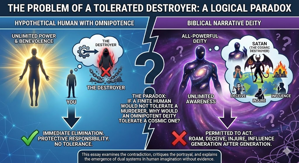 Yet the biblical story asks us to accept that an all-powerful deity knowingly allows Satan—depicted as far worse—to roam freely for millennia. If no sane omnipotent being would tolerate such evil for a moment, the Bible’s depiction of God’s tolerance of Satan strains rational coherence.