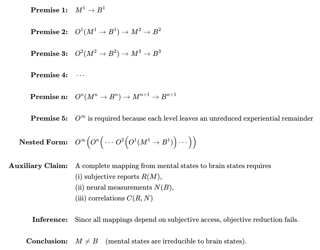 for arbitrarily large , with no metaphysical residue required. The infinite representational tower is simply more neural dynamics, not evidence of ontological dualism.