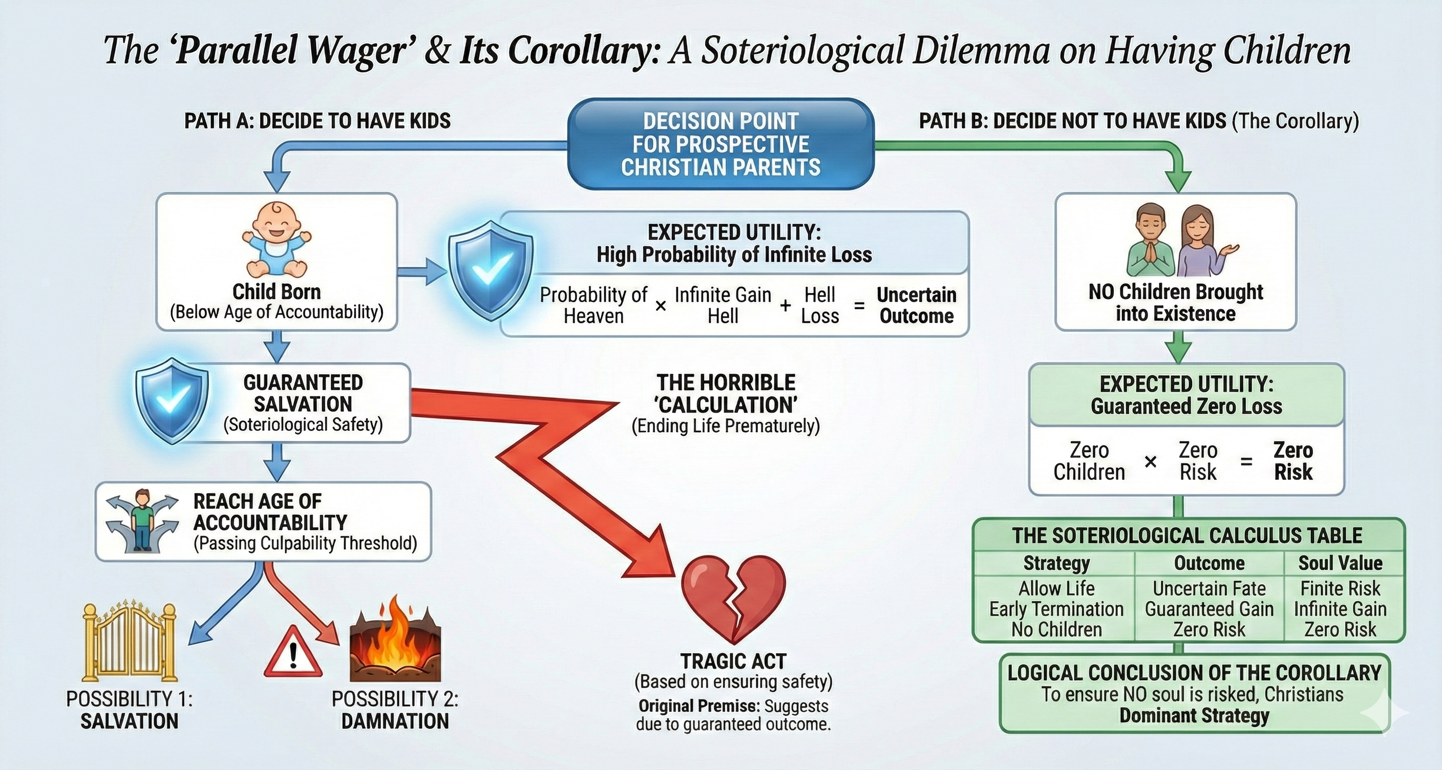 While this defense attempts to solve the moral problem of the massacre, it inadvertently creates a much larger logical problem. If we take the premises of conservative Christian soteriology seriously and subject them to a rigorous decision-theoretic analysis, we arrive at a horrifying conclusion: the most effective way to maximize human well-being is not evangelism, but infanticide.