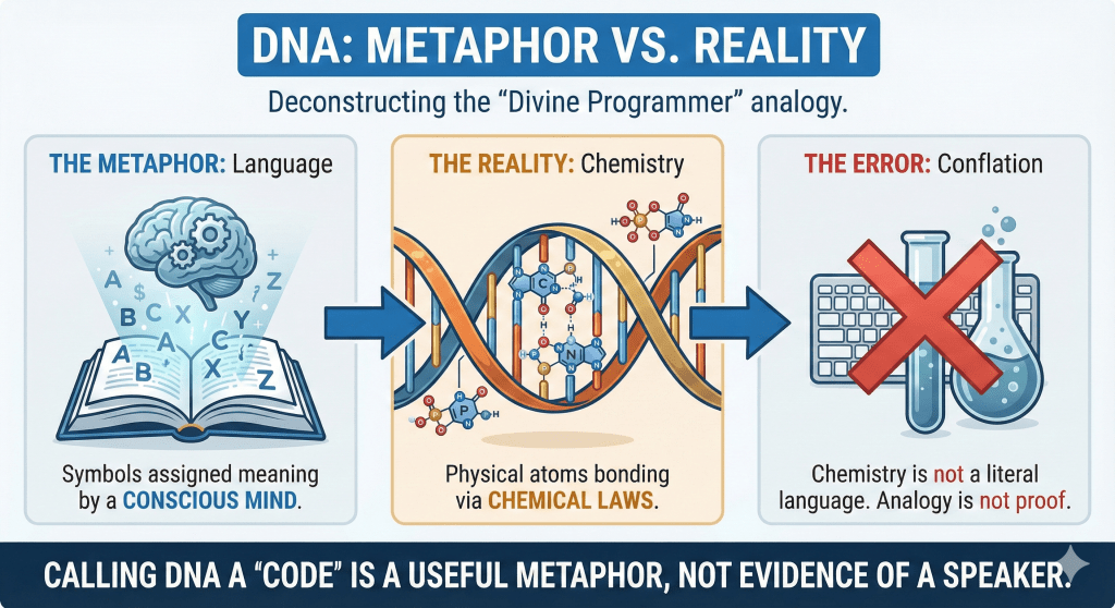 “DNA is a coded language, therefore a mind” treats metaphors as literals