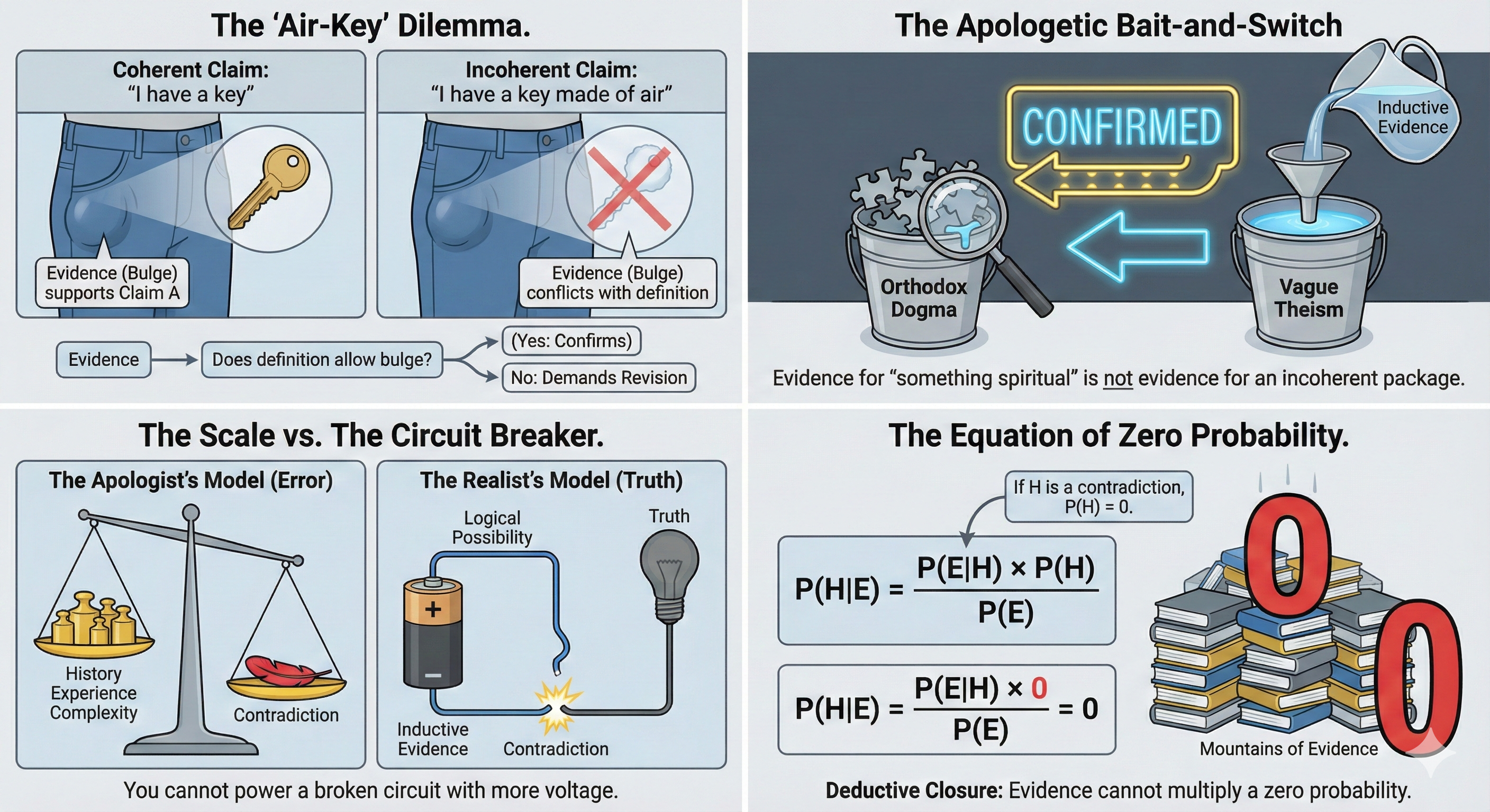 But evidence cannot do the one thing apologists want it to do when the target is incoherent: it cannot make an impossible proposition-set become possible.