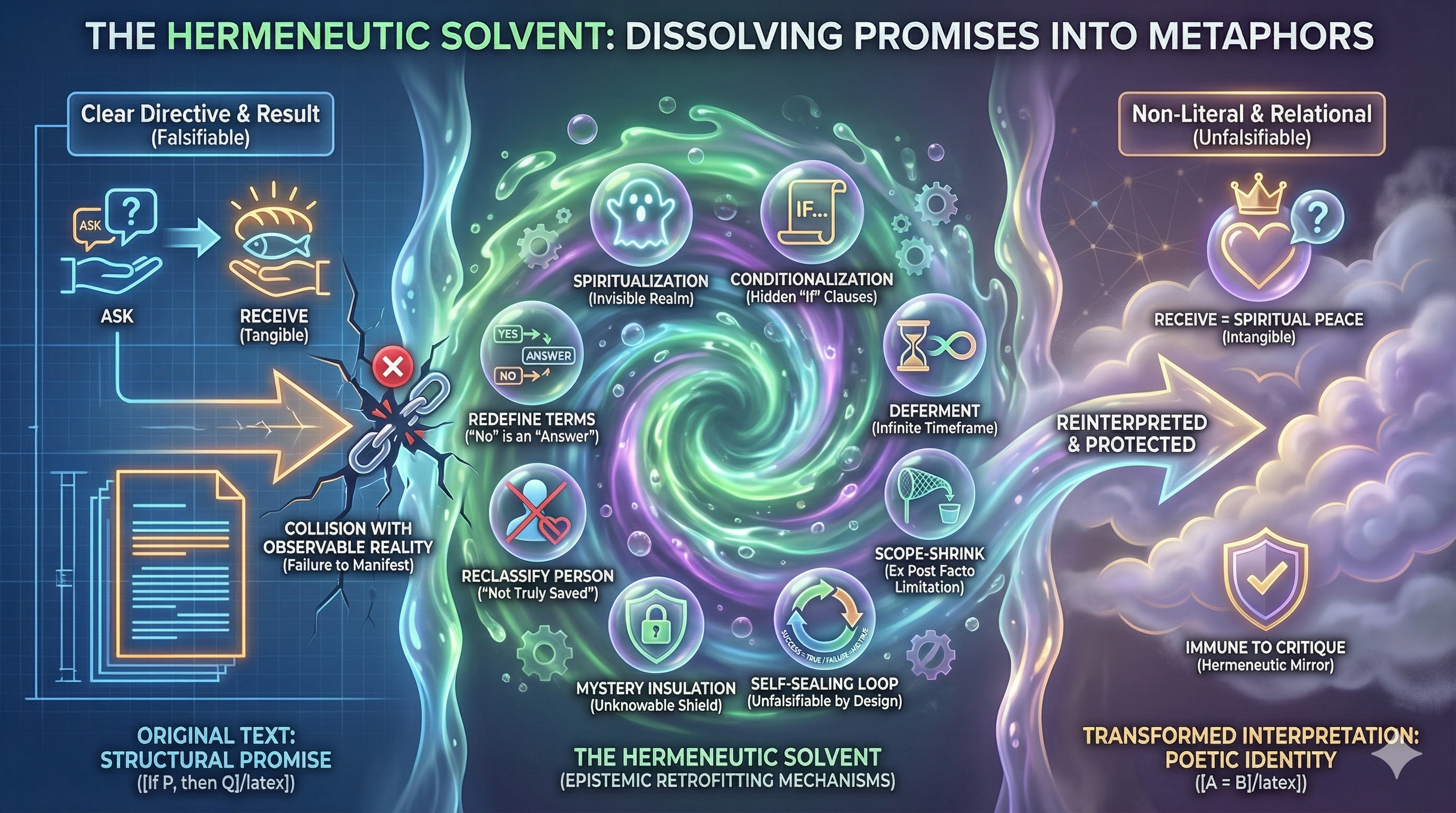 The problem emerges when these promise-shaped passages fail to materialize in observable experience. Rather than accepting the falsification of the claim, a specific interpretive method is often deployed. This method acts as a “hermeneutic solvent,” dissolving the structural integrity of the promise and recategorizing it as metaphor specifically to protect it from failure. This process is a form of epistemic retrofitting.