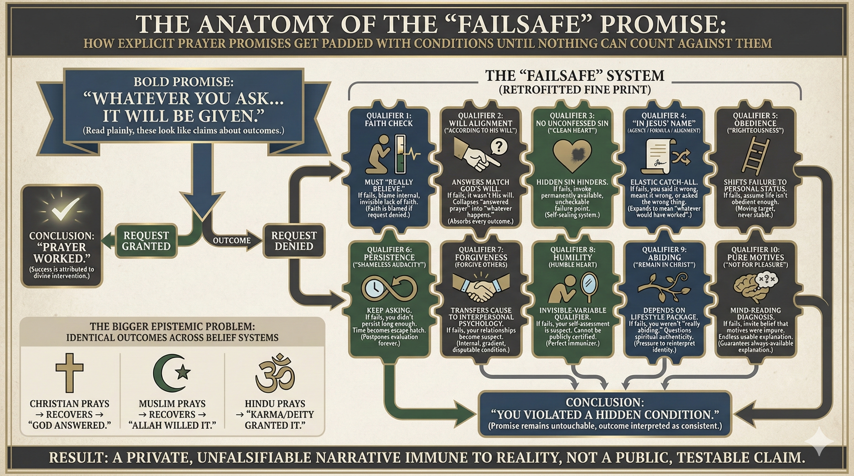 How it works as a failsafe: If the request fails, the explanation becomes internal and invisible: you didn’t believe enough. That shifts the claim from “God answers” to “God answers when your inner state meets an unmeasurable threshold.”