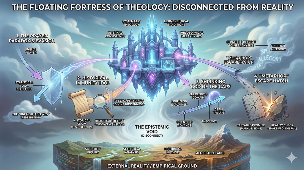 This disconnect is not an accident; it is a necessary survival mechanism. Theology survives only by insulating its core claims from the standards of verification that we apply to every other aspect of human existence. When the internal claims of the fortress try to land on the external ground of reality, they evaporate upon impact.