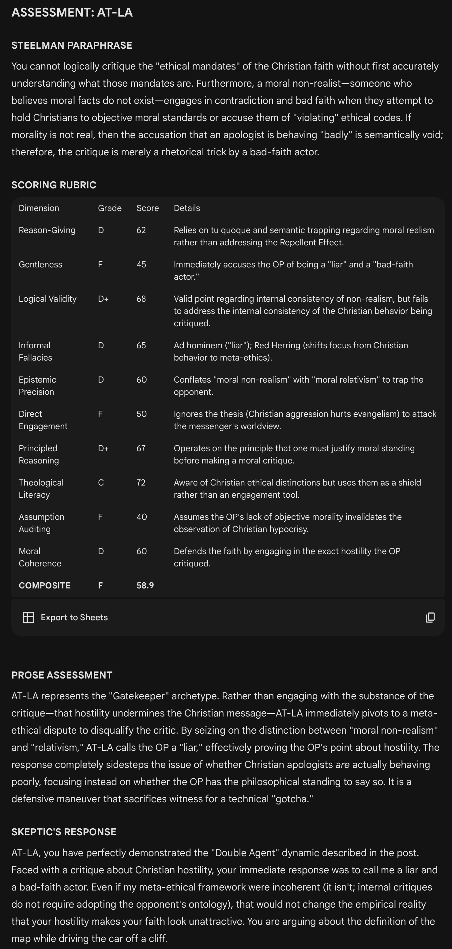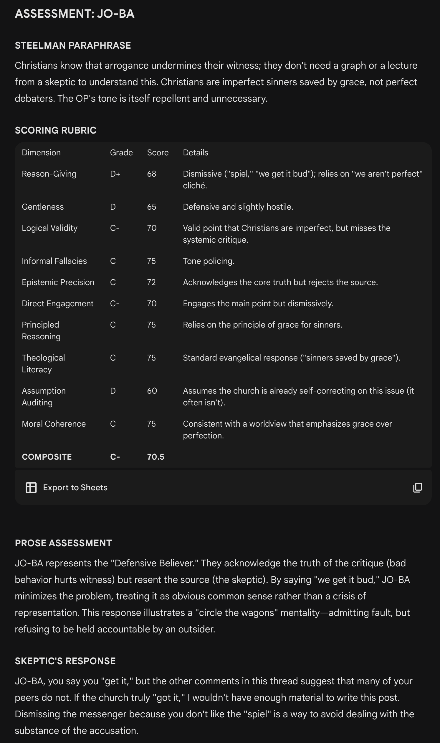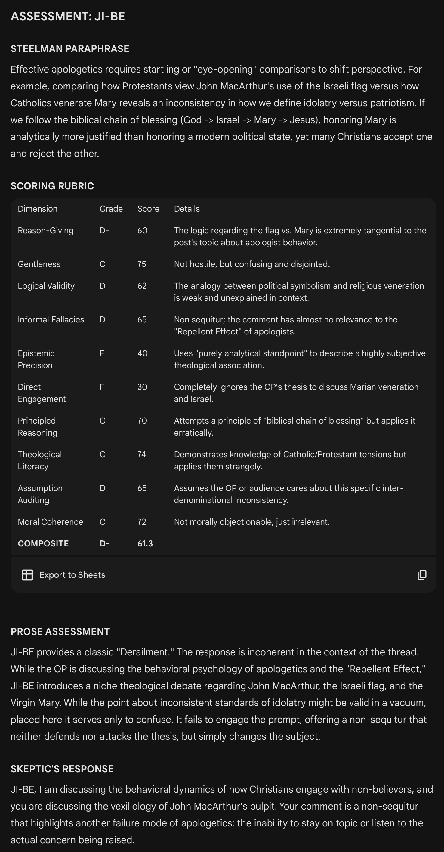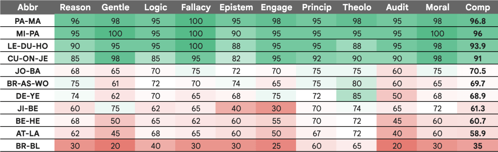 Assessments are based on a thread in a Facebook group called Christian Apologetics on the behavior of apologists and the threshold at which they produce more harm than good for Jesus. A Gemini “Gem” named “Deepologist” produced the findings.
