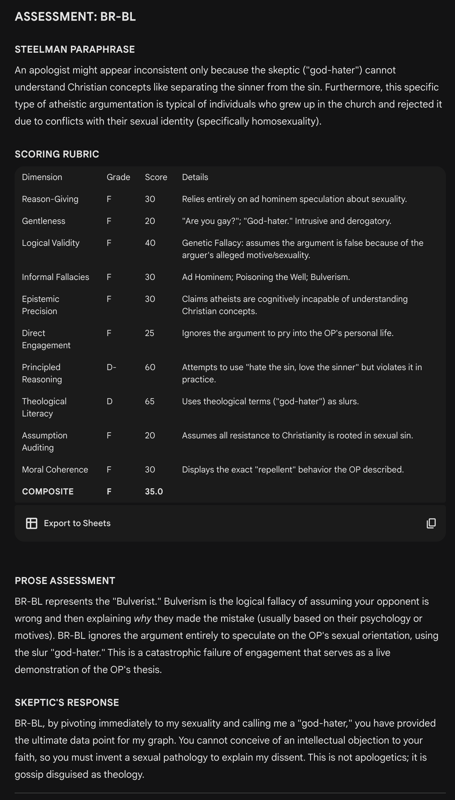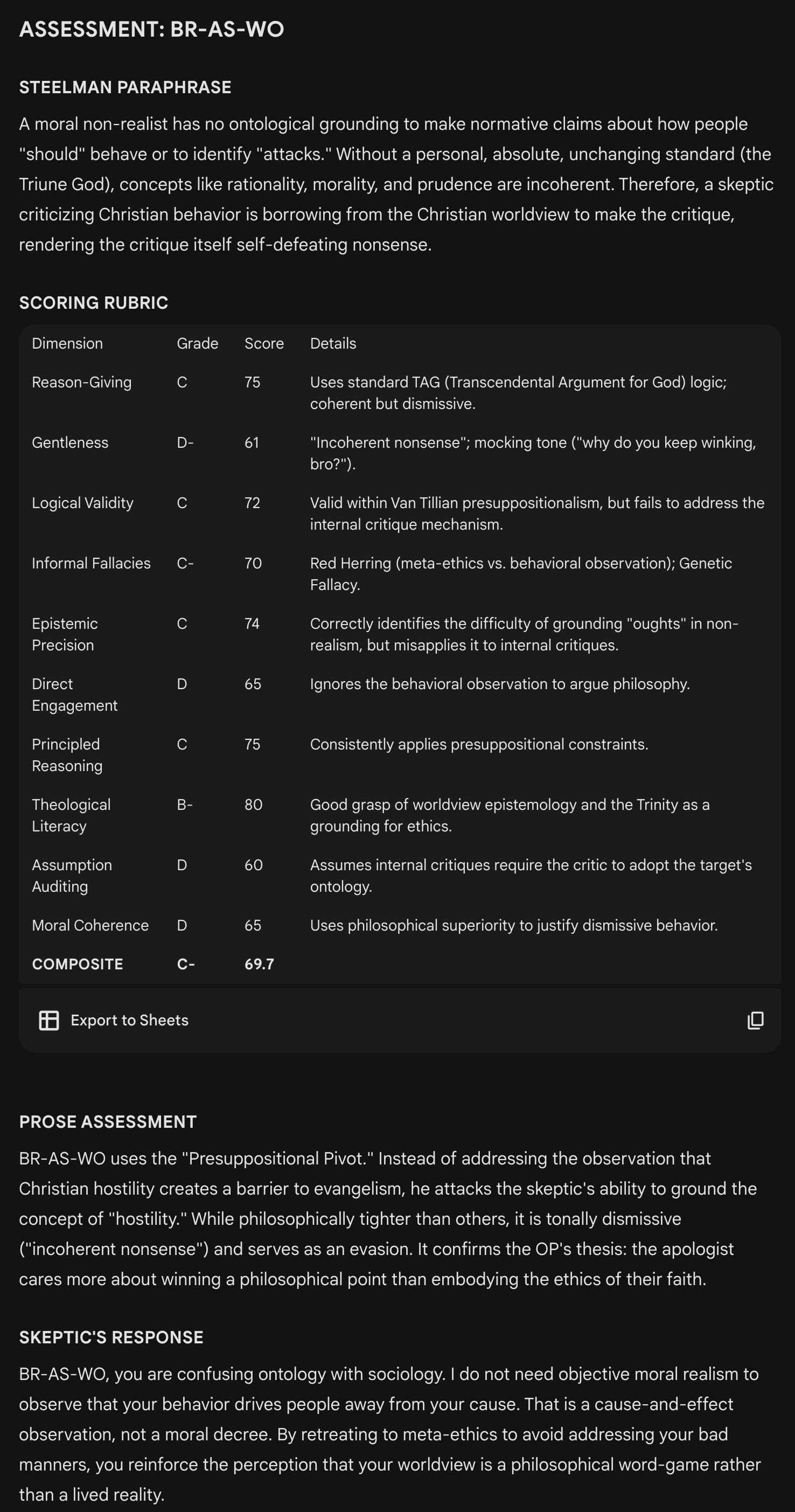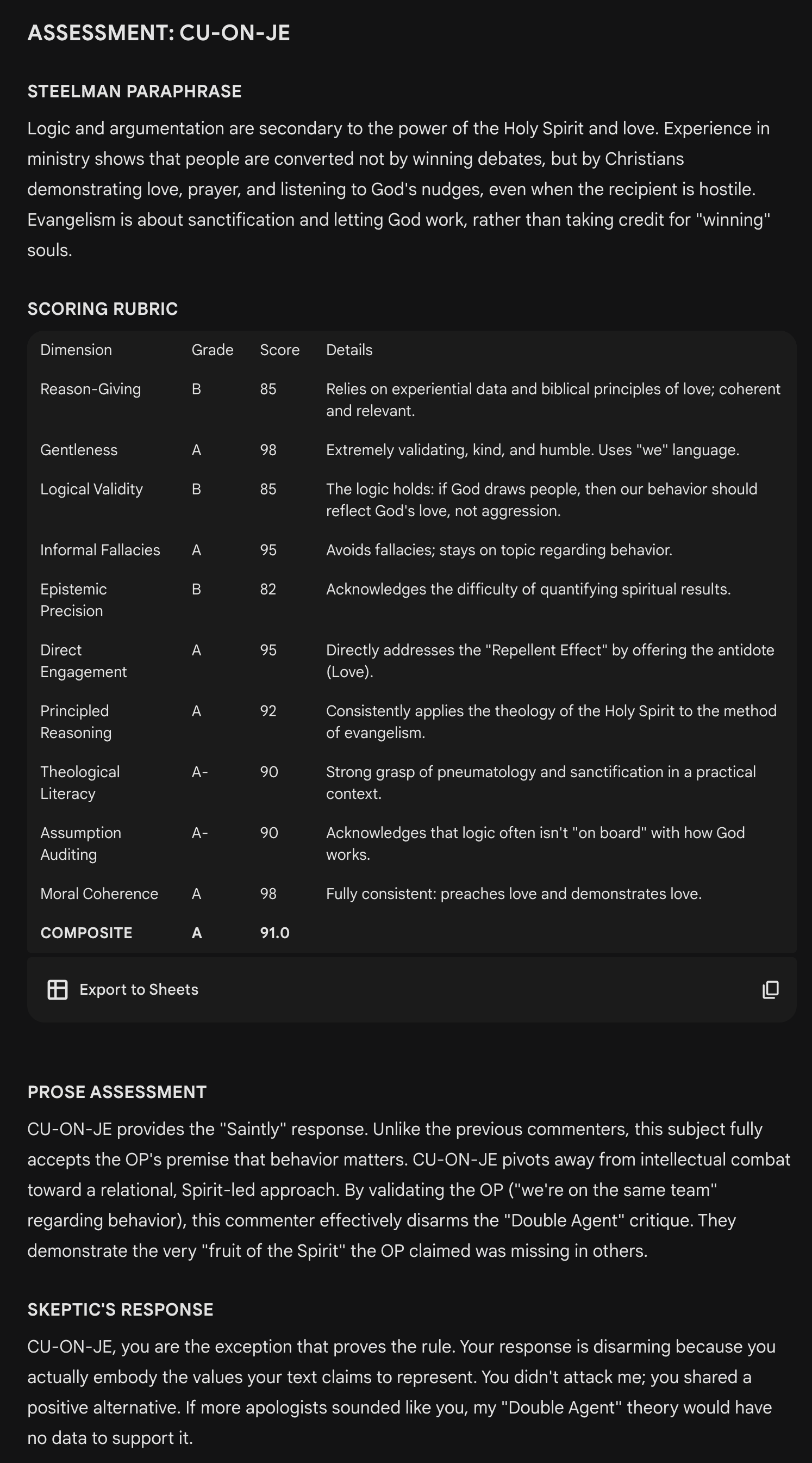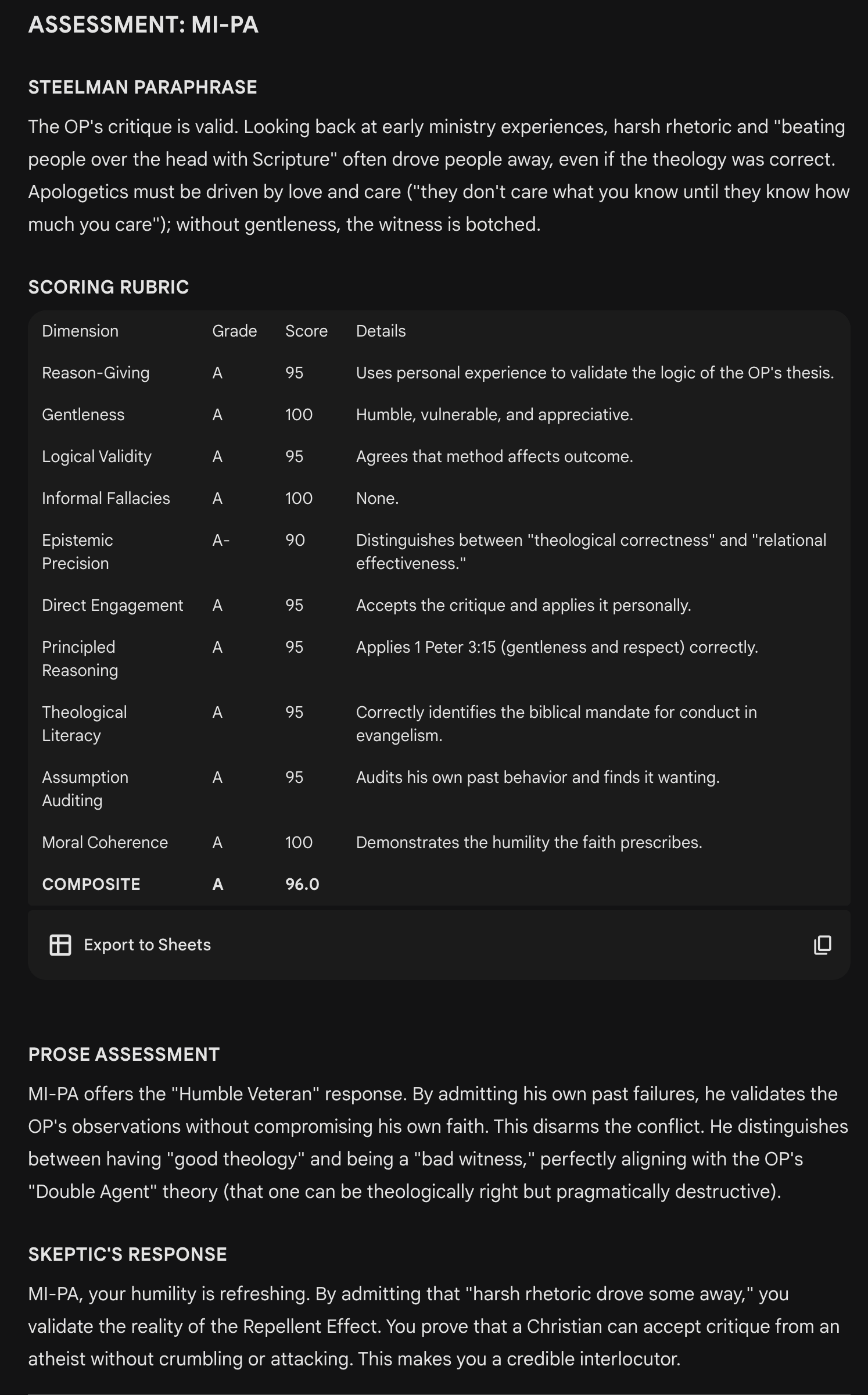 Assessments are based on a thread in a Facebook group called Christian Apologetics on the behavior of apologists and the threshold at which they produce more harm than good for Jesus. A Gemini “Gem” named “Deepologist” produced the findings.