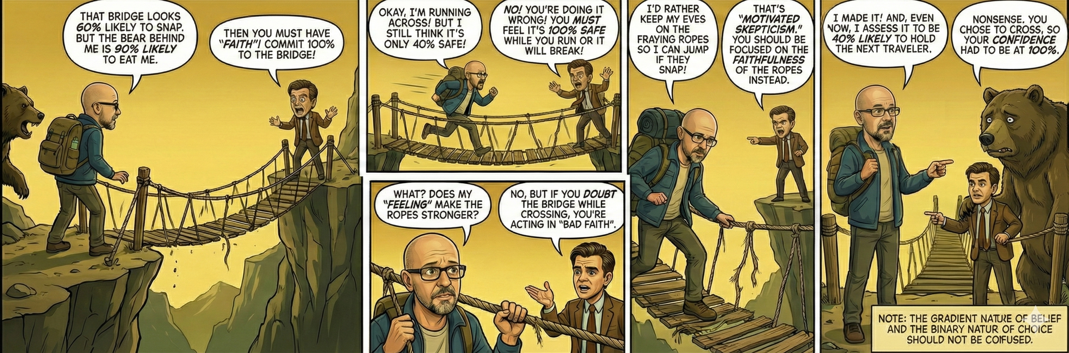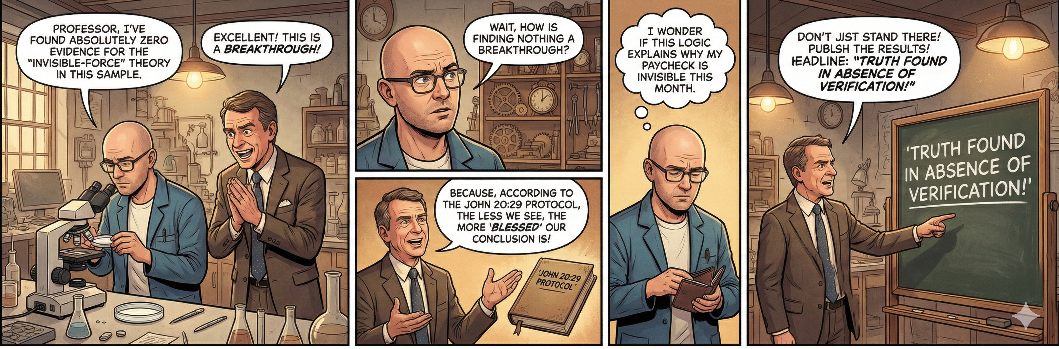 The conflation of various meanings of πίστις / πιστεύω is particularly problematic in apologetic arguments that attempt to present biblical faith as rational or evidence-based. Some Christian apologists claim that belief in Jesus is akin to trusting in a reliable source of information, likening faith to the rational acceptance of a well-proven theory (STR). However, this interpretation is selectively using one sense of πίστις—that of “trust”—to argue that biblical faith is proportional to evidence, while ignoring passages that emphasize faith as a leap beyond what can be proven or seen, such as John 20:29, where Jesus praises those who believe without seeing.