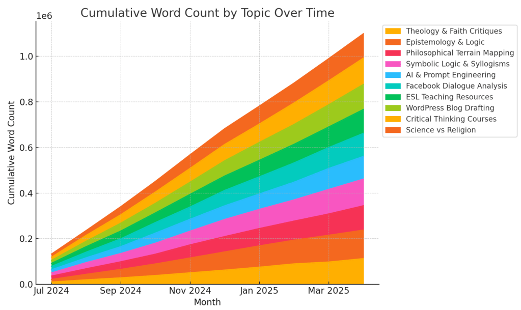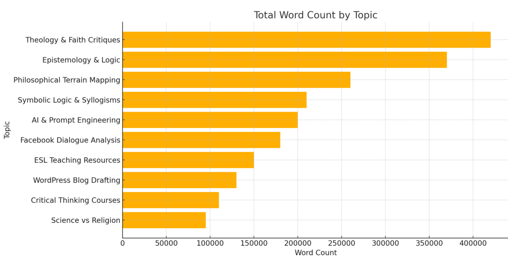 - Total Word Count by Topic – showing your top focus areas like Theology & Faith Critiques and Epistemology & Logic.